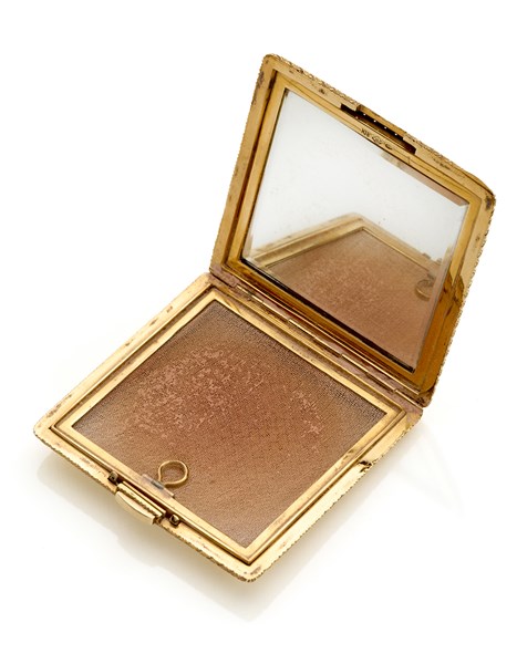 Portacipria quadrato in oro giallo lavorato a cestino, specchio allinterno, lo
