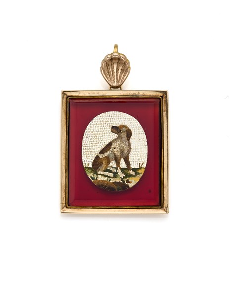 Dog shaped micromosaic set on a red glass paste and red 9K gold pendant, g 8.15 circa, length cm 4.80 circa. In original case
