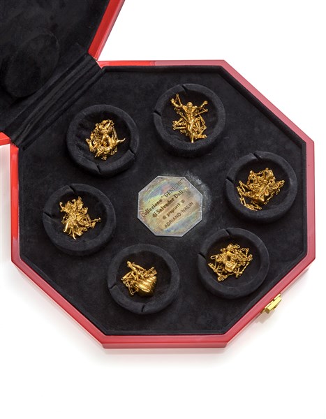 Collezione "Genesis": sei catene in oro giallo scomponibili in girocollo e bracciale con sei fusioni a cera persa pendenti, complessivi g 294,82 circa, lungh. cm 64,00 circa. Tutti firmati, numerati e marcati Dalì, I. 76/1000, 45 PV. In scatola originale firmata Dalì e con documentazione d'acquisto.
