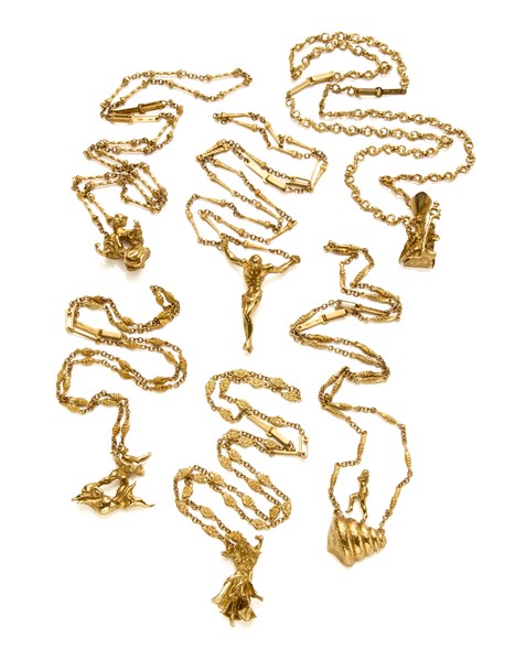 "Genesis" collection: six yellow gold chains and pendants used together as a necklace or broken down into six separate bracelets, in all g 294.82 circa, length cm 64.00 circa. All signed, numbered and marked Dalì, I. 76/1000, 45 PV. In original case signed Dalì and with original purchase paper