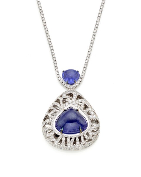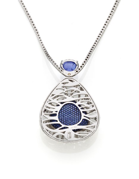 Collana in oro bianco e diamanti con al centro una tanzanite a goccia di ct. 9,50 circa a tenere un pendente rimovibile di cm 6 circa in diamanti con tanzanite a goccia cabochon di ct. 40,00 circa e zaffiri sul retro, diamanti per complessivi ct. 12,00 circa g 56,25 circa, lungh. cm 42 circa. Marcato 2297 MI e con logo. Con Garanzia originale