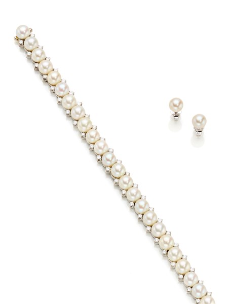 Demi-parure in oro bianco e perle coltivate composta da bracciale di cm 17,5 circa rifinito in diamanti per complessivi ct. 1,10 circa e orecchini a lobo, complessivi g 35,03 circa. Con custodia (lievi difetti)