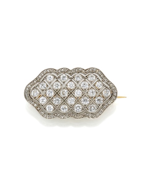 Broche in platino e diamanti per complessivi ct. 2,30 circa, pin in oro giallo,