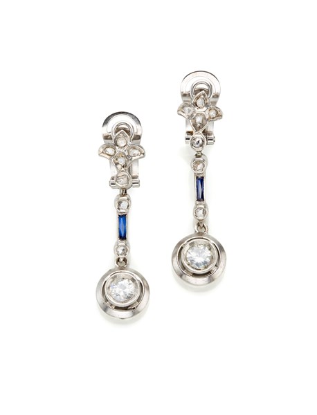 Orecchini pendenti in oro bianco e diamanti rotondi per complessivi ct. 0,70 circa, rifiniti con diamanti a mezza rosetta e zaffiri a baguette, g 5,65 circa, lungh. cm 3,70 circa.