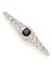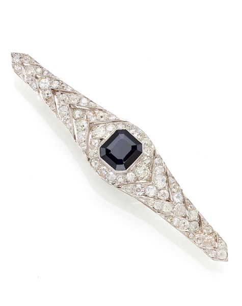 Broche a barretta in oro bianco, diamanti old mine per complessivi ct. 4,50 circa e zaffiro ottagonale centrale di ct. 7,05 circa, g 22,83 circa, lungh. cm 9,10 circa.