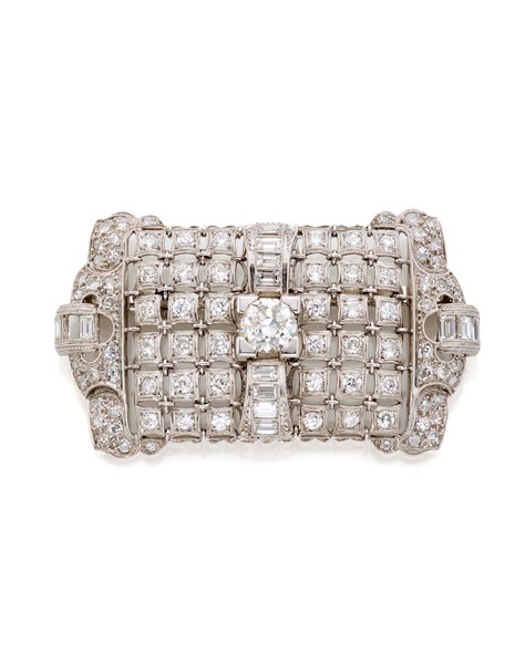 Lotto 888 | Spilla rettangolare traforata in platino con diamanti tondi e baguette per comp