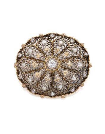 Spilla/pendente ovale in oro giallo e argento lavorata a traforo con diamante centrale rotondo di ct. 0,45 circa e a mezza rosetta, g 12,75 circa, lungh. cm 4,70 circa.