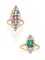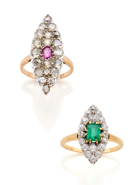 Lotto in oro giallo e bianco composto da due anelli a navette con diamanti old mine, uno con rubino ovale e l'altro con smeraldo ottagonale, diamanti per complessivi ct. 1,70 circa, complessivi g 8,92 circa misura 17,5/57,5.