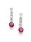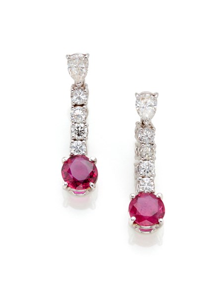 Orecchini pendenti in oro bianco, diamanti per complessivi ct. 0,80 circa e rubini per complessivi ct. 1,20 circa, g 3,68 circa, lungh. cm 2,40 circa.