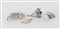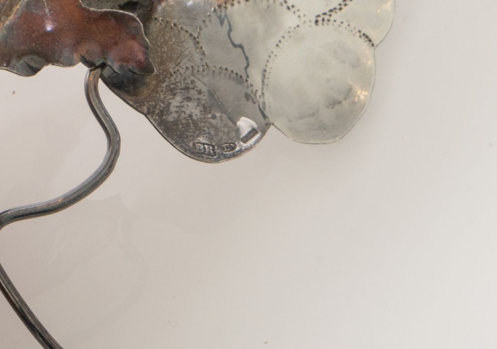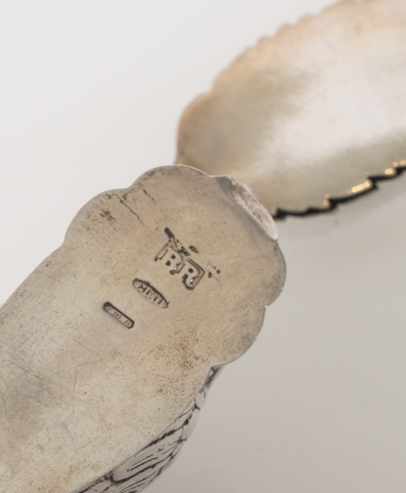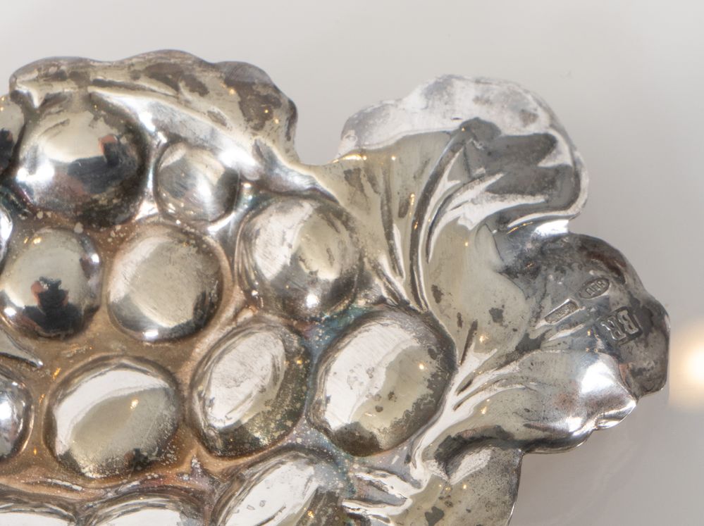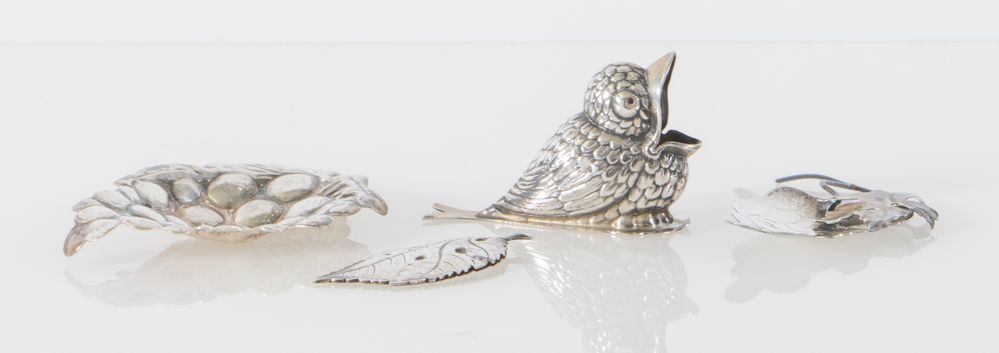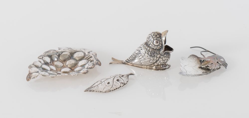 BRANDIMARTE, Firenze, XX secolo. Lotto composto da quattro oggetti in argento. Ogni pezzo reca punzoni: qualità dell'argento, stemma dell'argentiere e losanga locativa. Grappolo d'uva: cm 10x7,5x4,7; uccello: cm 4,7x7,5; foglia: cm 6,5x2,5; grappolo d'uva: cm 8,5x6,5. Peso complessivo: 77 gr.