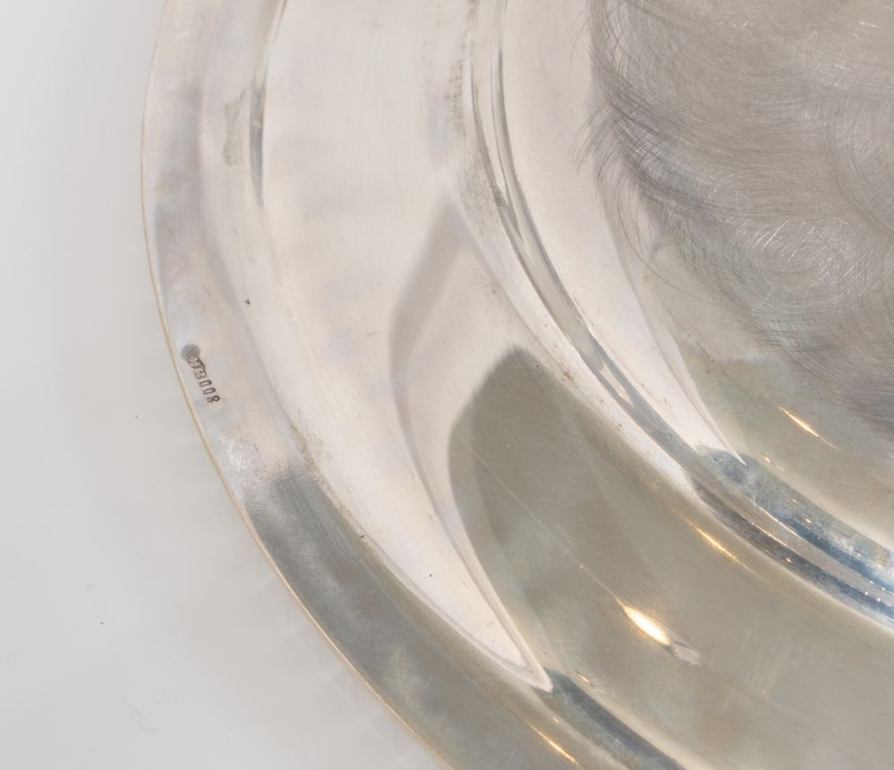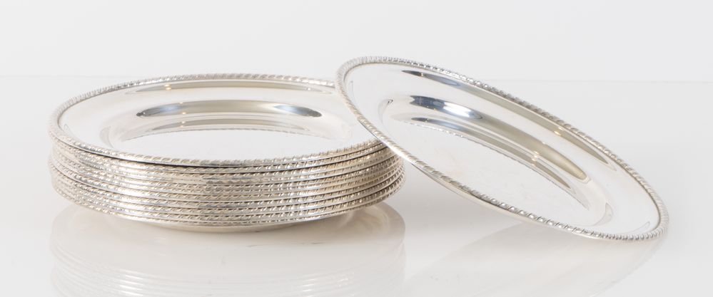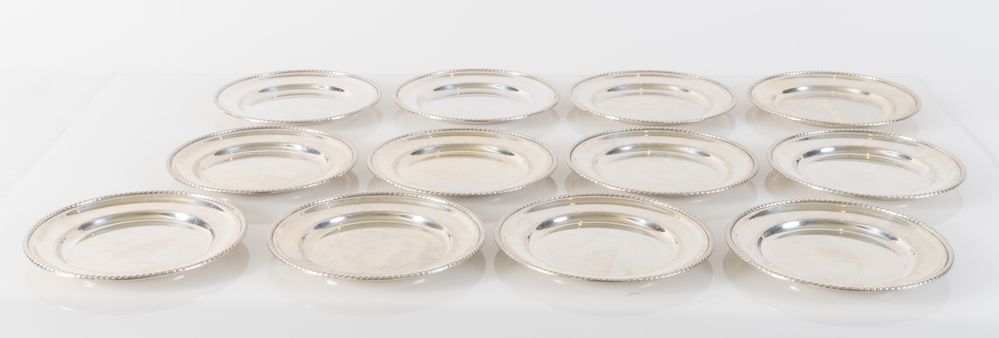 GREGGIO RINO, Padova, inizio del XX secolo. Lotto composto da dodici piattini in argento 800. Sul retro inferiore recano punzoni: 800 e losanga locativa 29PD. Cm 19,5. Peso complessivo: 2086 gr.