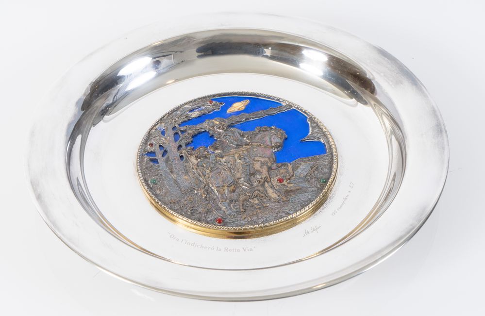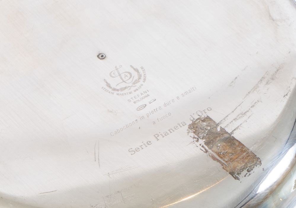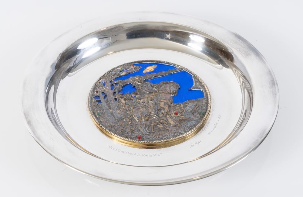 ARGENTERIA e OREFICERIA STEFANI, Bologna, dal 1968. Fondina in argento 800, con parti dorate con oro 24 Kt, smalti a gran fuoco, cabochon di pietre dure, dal titolo “Ora t'indicherò la retta via”. Fondina numerata e firmata: esemplare n. 57 di 199. Serie Pianeta d’oro. Alla base reca firma Ale Stefani. Al retro reca punzoni: marchio di Stefani Maestri Orafi Argentieri, Stefani, Bologna, 800, losanga locativa 9BO, serie Pianeta d'Oro, tecnica. Ø: cm 26,2. Peso complessivo: 419 gr.