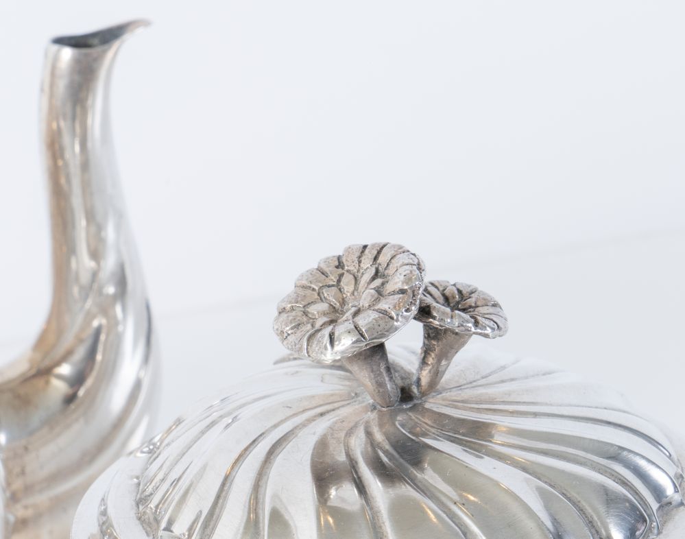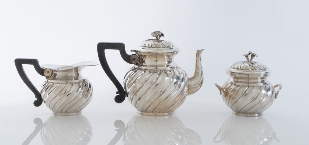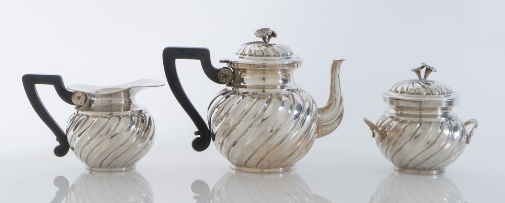 ARGENTIERE M.L., anni '20 del XX secolo. Servizio in argento 800 con manici in legno composto da tre elementi: teiera, lattiera e zuccheriera. Sotto la base recano punzoni: 800 in campo libero e M.L.