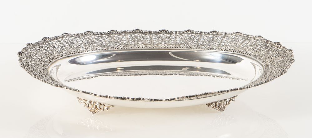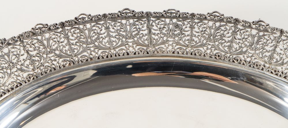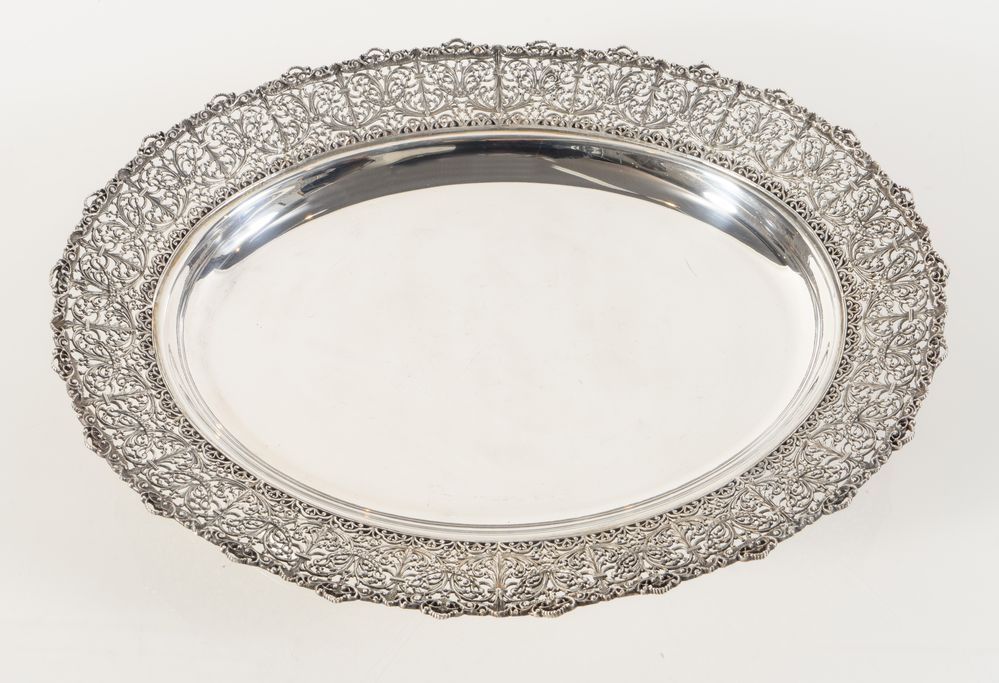 TADIELLO GAETANO, XX secolo. Vassoio con bordo finemente decorato. Su un bordo reca punzoni: 800 e MI515. Cm 5x36x29,5. Peso: 714 gr.