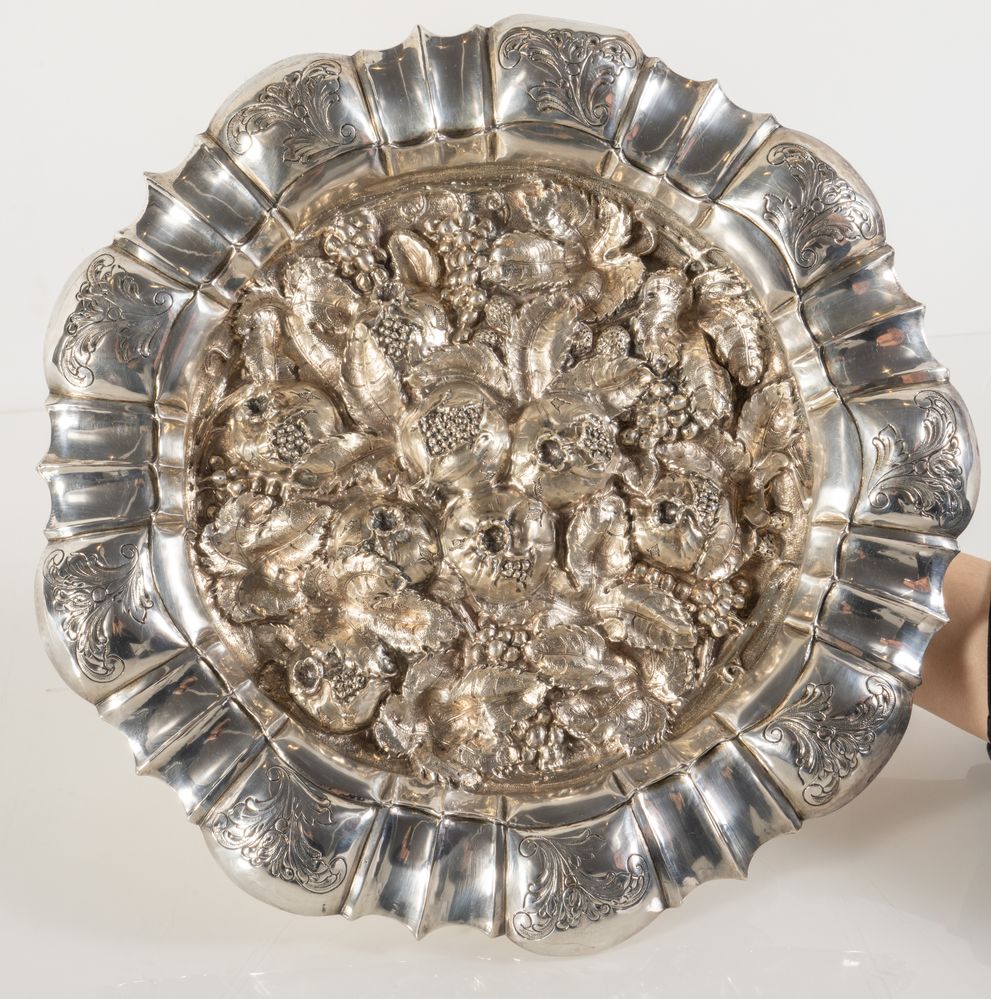 FABBRICA ARGENTERIA FIORENTINA di BARTOLINI BARTOLOZZI & C. S.A.S., metà del XX secolo. Piatto in argento 800, con parte centrale decorata con melograni. Su un bordo reca punzoni: 800 e losanga locativa 215FI. Cm: 3,5x Ø34. Peso: 873 gr.