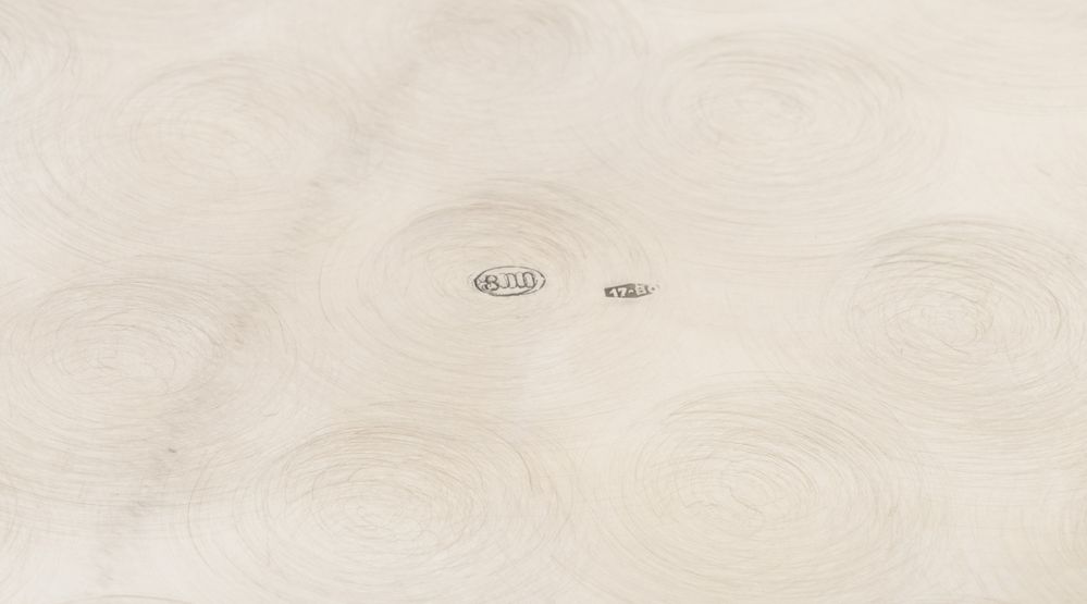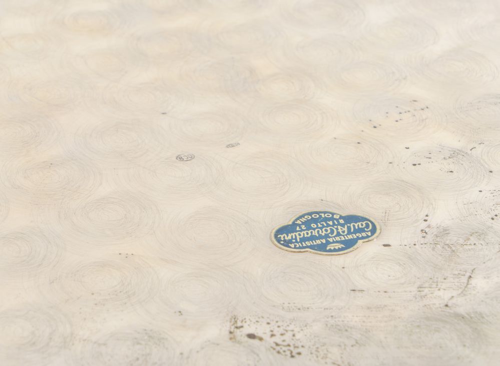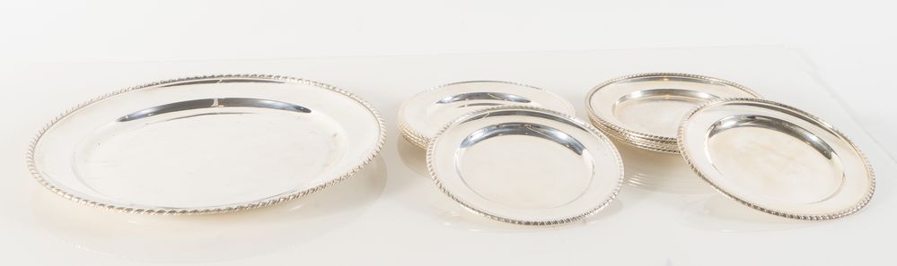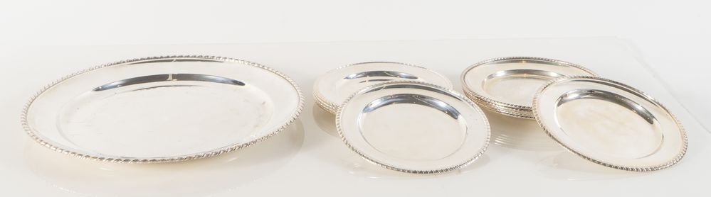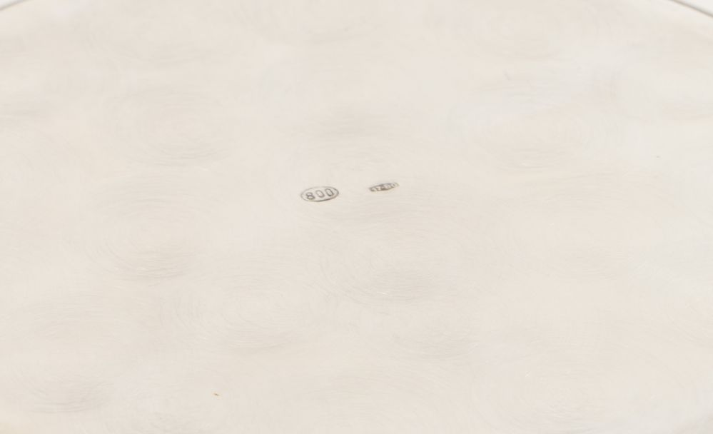 Nord Italia, metà del XX secolo. Lotto composto da undici piatti e un vassoio in argento 800. Sotto la base recano punzoni: 800 e losanga locativa (29Pd nei piatti, 17BO nel vassoio). Piatto grande: cm 2,5x Ø 35,5. Piatti piccoli: cm Ø19 cadauno. Peso totale: 2774 gr.