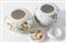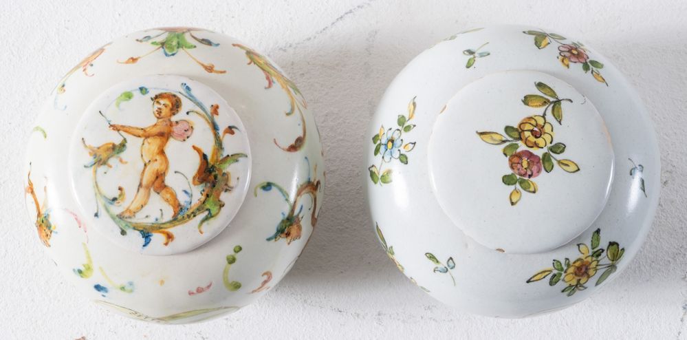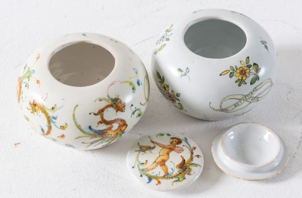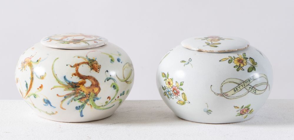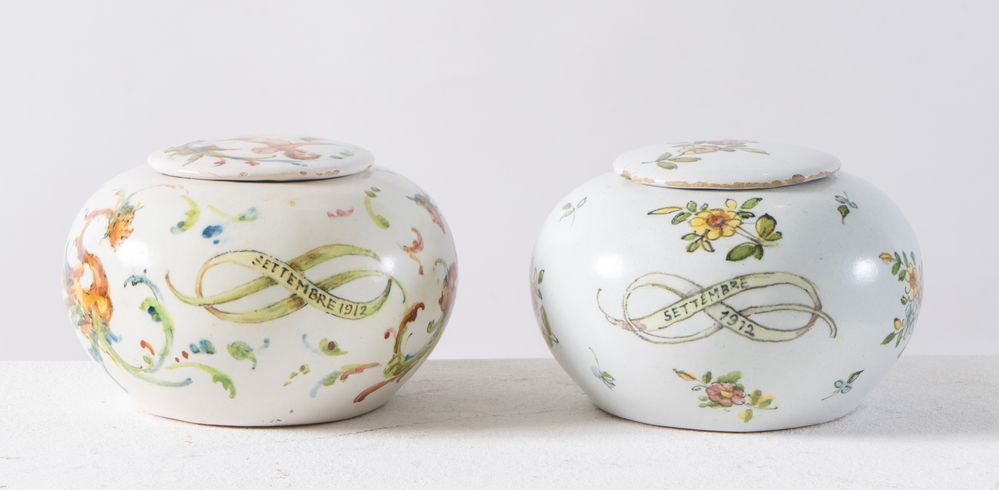 MANIFATTURA MINGHETTI, Bologna, inizi XX secolo. Coppia di ciotole con coperchio in ceramica,1912. Cadauna di cm 7,5xØ 10. All'interno recano marghi AM. Recano datazione settembre 1912.