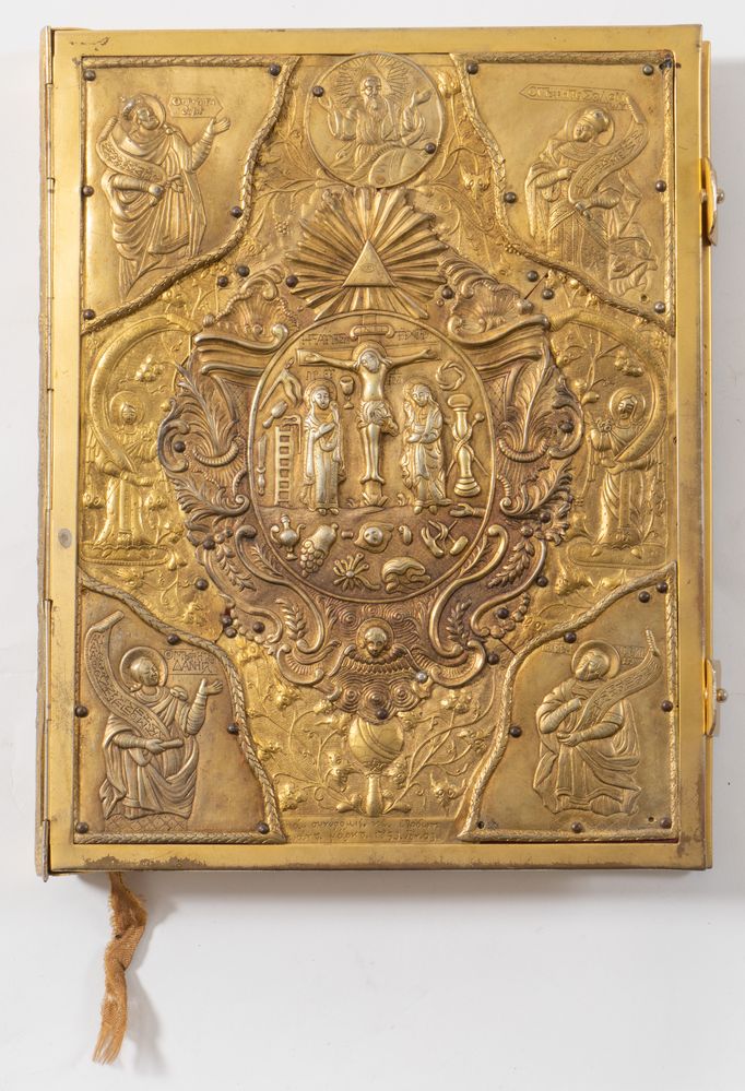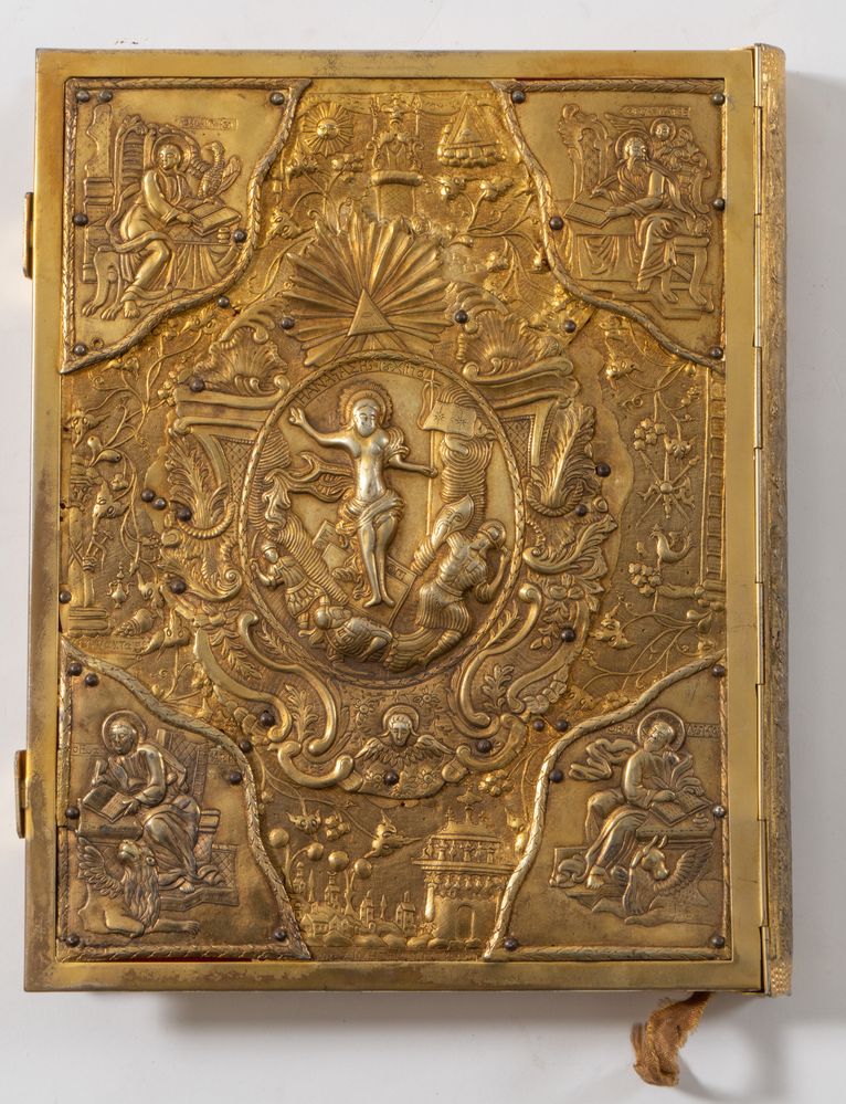 Messale con copertina in bronzo sbalzato e dorato. Grecia, fine del XIX secolo. Sulla copertina reca data incisa 1853. All'interno reca data 1899. Cm 32x25,2.