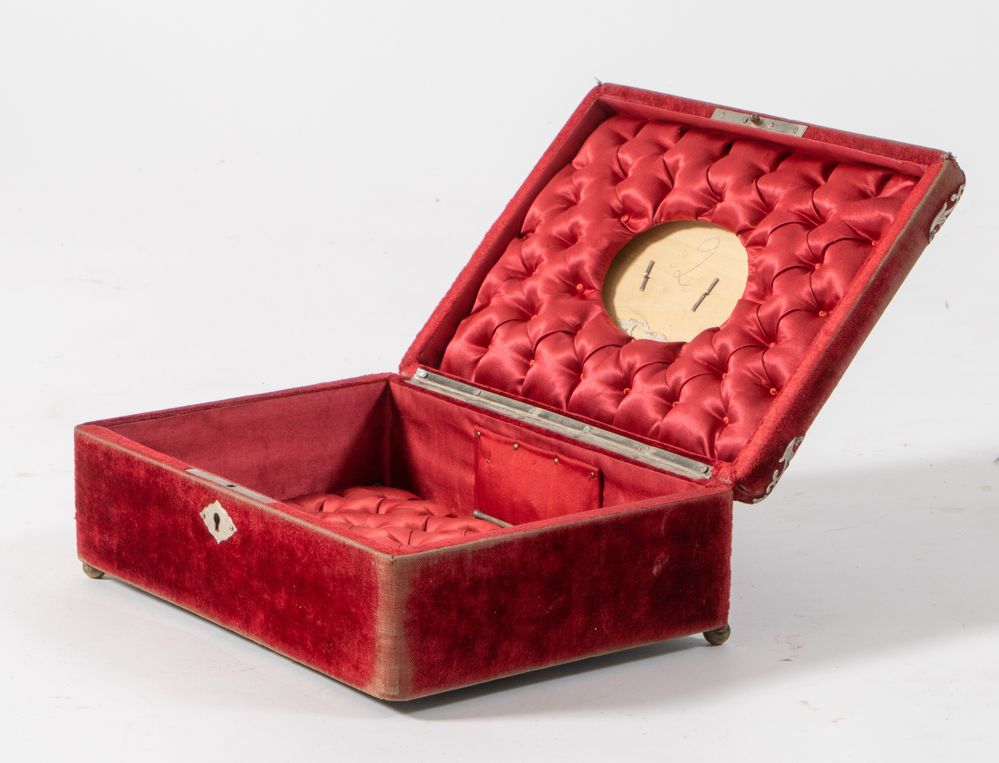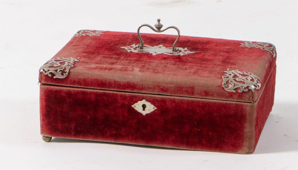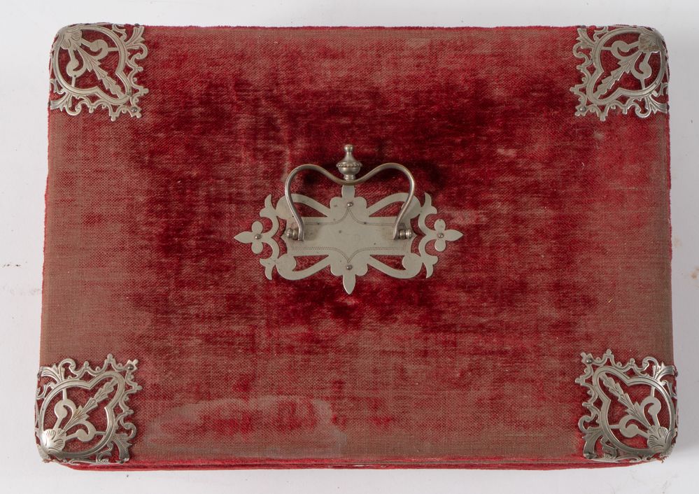 Scatola in velluto con applicazioni in metallo argentato. XIX secolo. Cm...