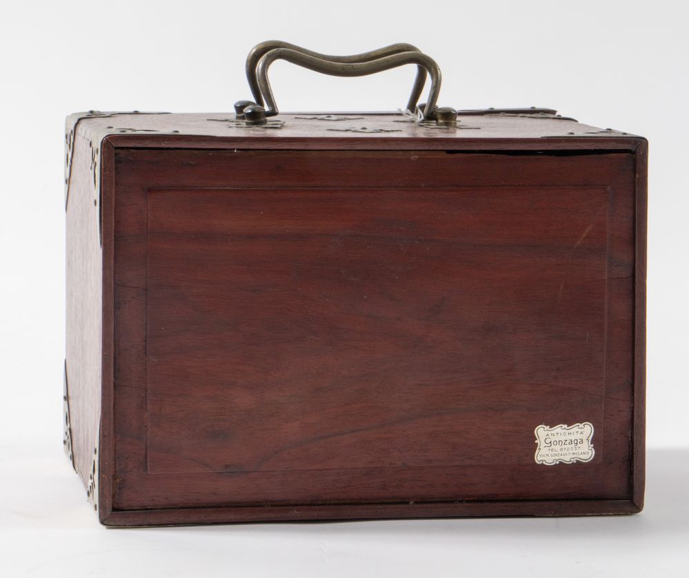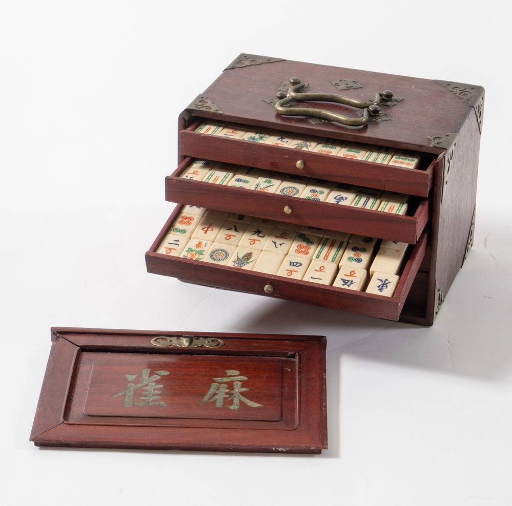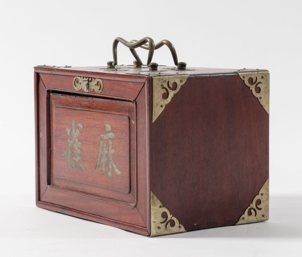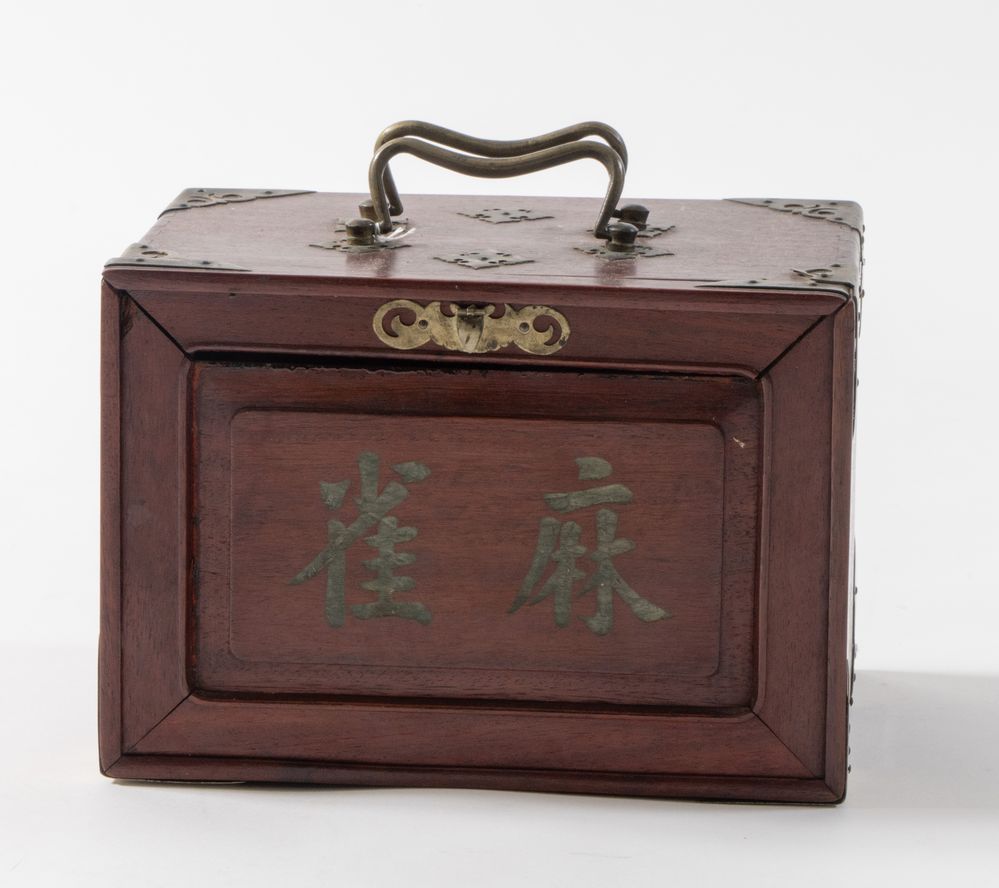 Scatola contenente gioco del MAH JONG in legno con applicazioni in bronzo. Pedine in legno di bamboo e materiale prezioso. Cina, XIX secolo - XX secolo. Cm 17x24x16. Lotto corredato da certificato per la libera circolazione.