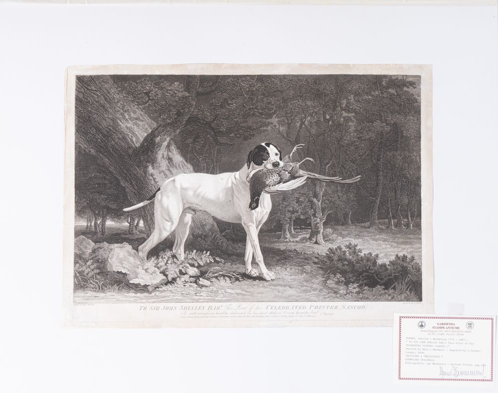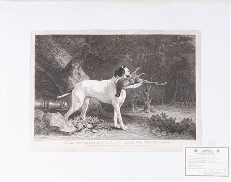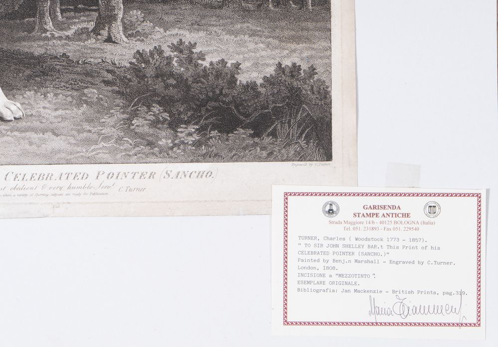 CHARLES TURNER (Woodsotck 1773 - 1857) "To Sir John Shelley Bar. t. This Print of his celebrated pointer (Sancho)", 1808. Incisione a mezzotinto. Cm 37,5x52. Esemplare originale. Stampato da C. Turner; dipinto da Benjamin Marshall. Bibliografia: Jan Mackenzei, British Prints, pag. 319. Reca etichetta di Garisenda Stampe Antiche Bologna con firma.