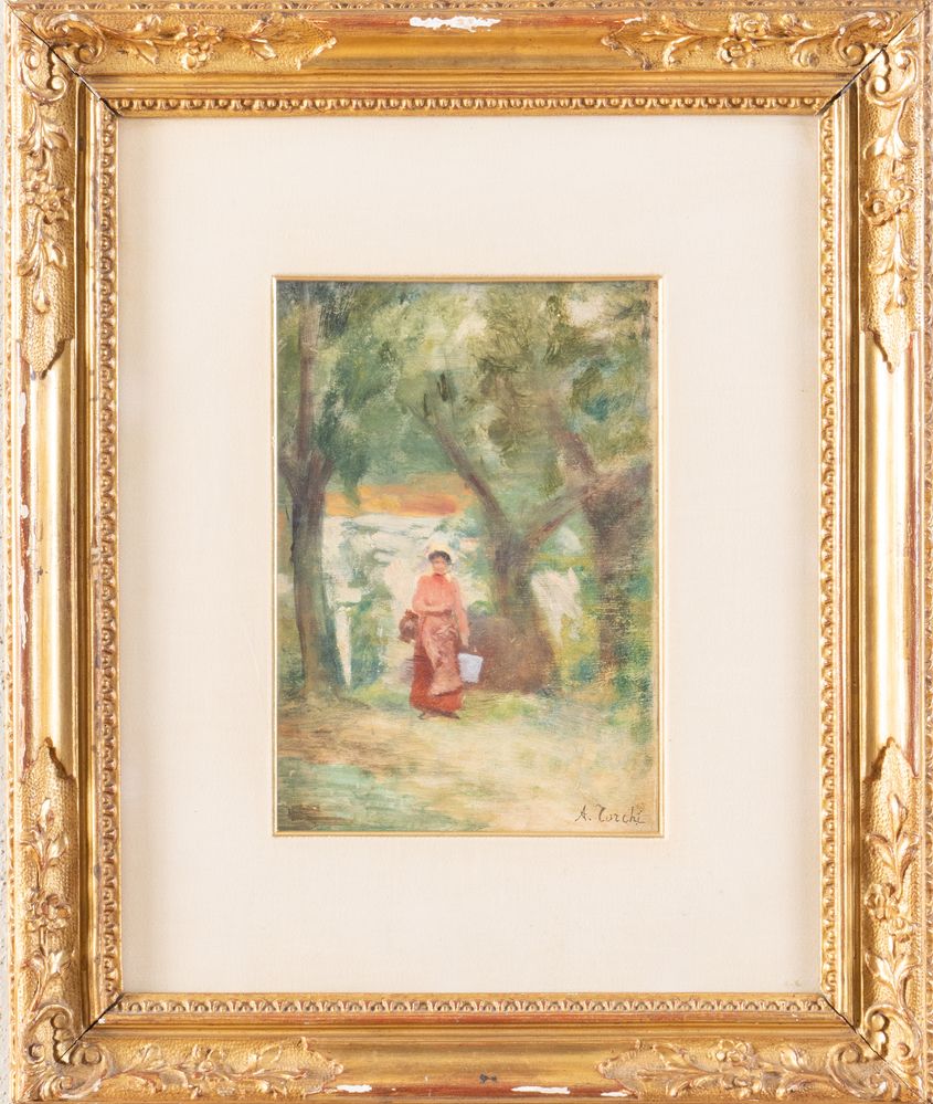 ANGELO TORCHI (Massa Lombarda 1856 - 1915) "Figura nel parco". Olio su...