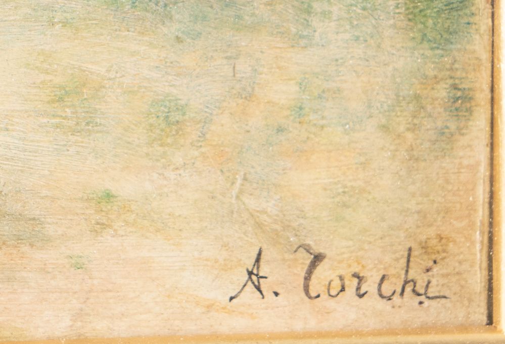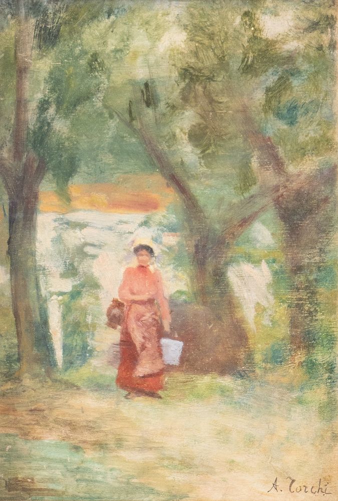 ANGELO TORCHI (Massa Lombarda 1856 - 1915) "Figura nel parco". Olio su cartoncino. Cm 24x17,5. Opera firmata in basso a destra A. Torchi.