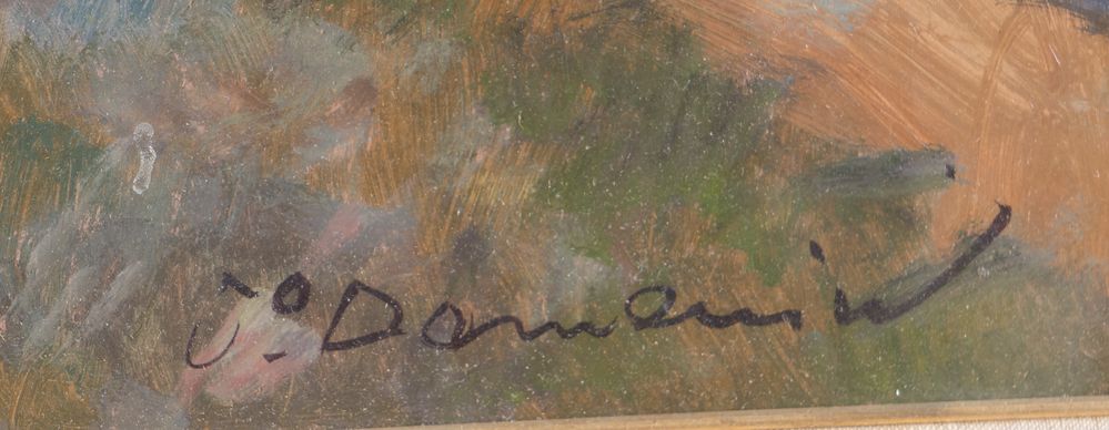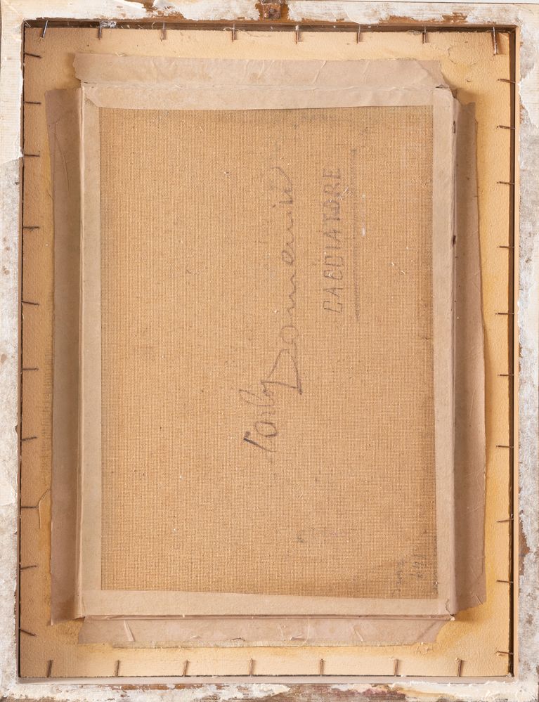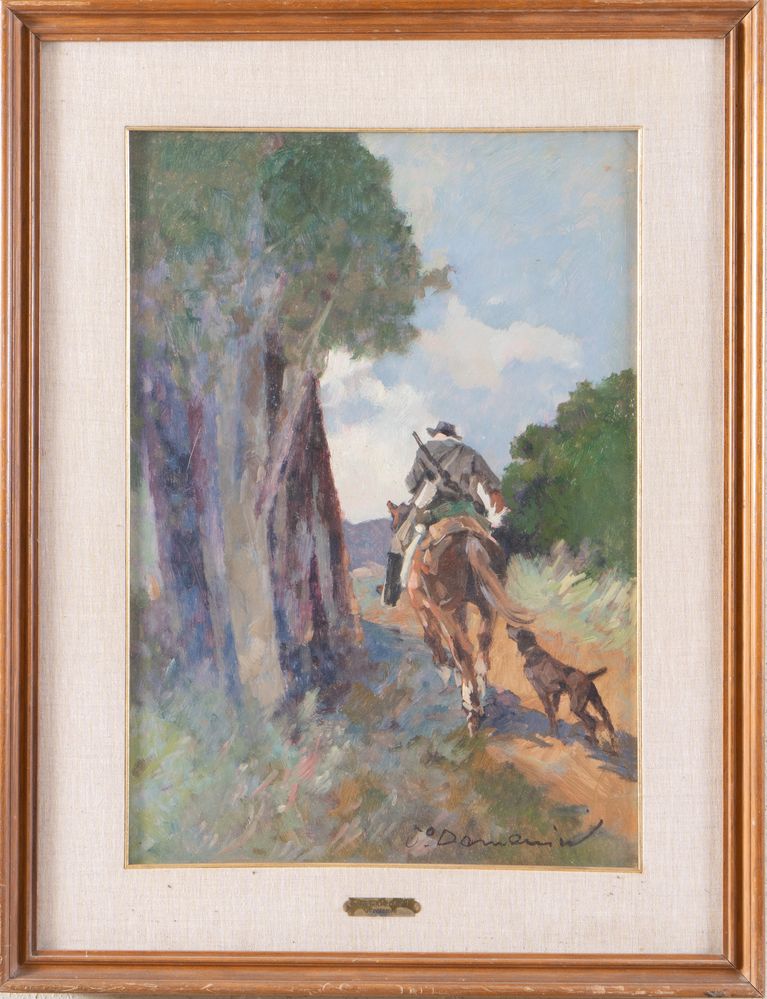 CARLO DOMENICI (Livorno 1897 - Portoferrario 1981) "Cacciatore". Olio su faesite. Cm 50x35. Opera firmata in basso a destra C. Domenici. Al retro opera firmata e intitolata Carlo Domenici, Cacciatore.