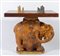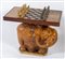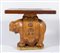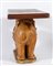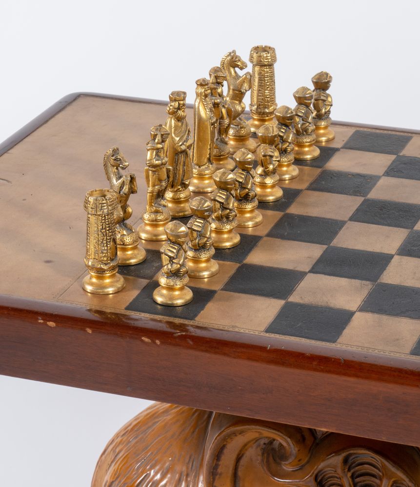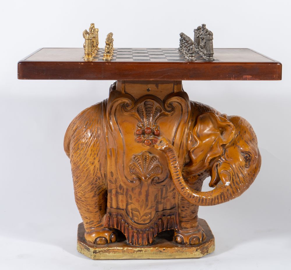 Tavolino scacchiera. Arte orientale, metà del XX secolo. Reca supporto in gesso policromo a guisa di elefante, piano incorniciato in mogano e scacchiera in pelle. Scacchi in bronzi, metà dorati e matà argentati. Cm 62,5x74x44.