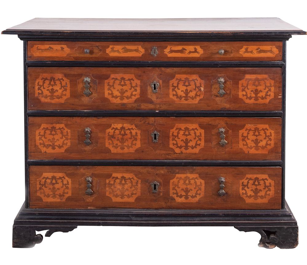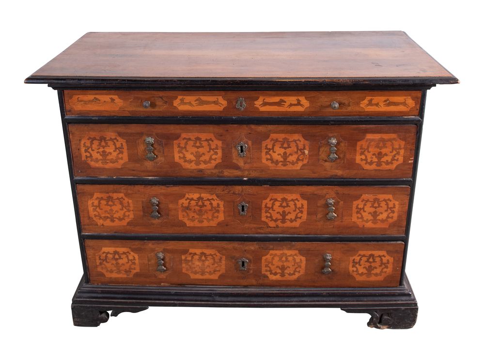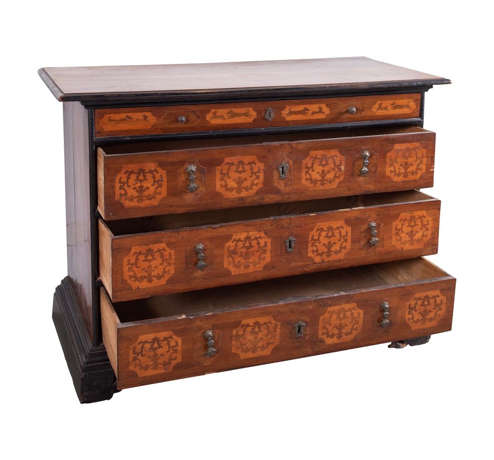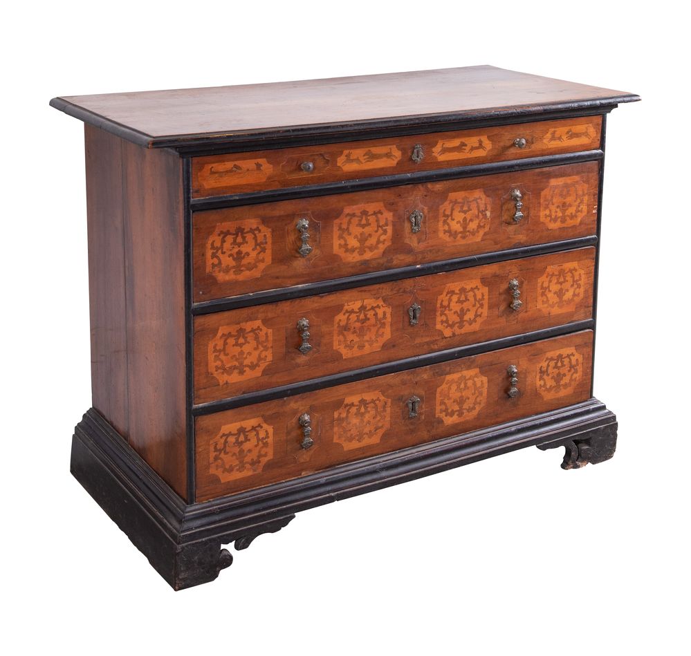 Canterano in massello di noce con cassetti intarsiati in acero e frutto. Brescia, fine del XVII secolo. Reca cornici ebanizzate. Cm 100x139x65.