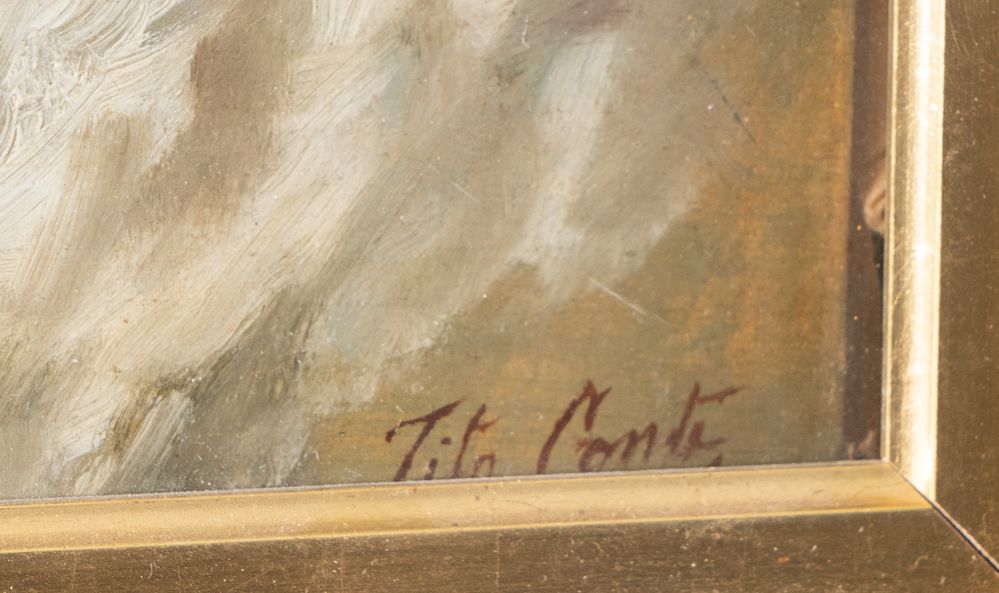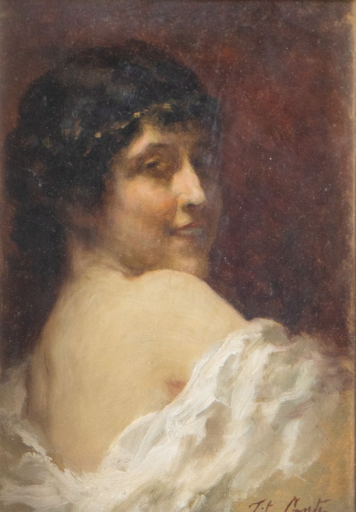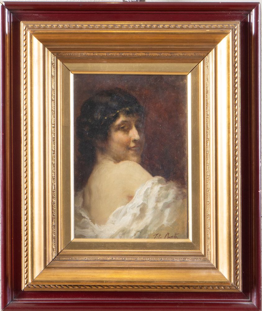 TITO CONTI "Ritratto di donna". Olio su tavola. Cm 24x18,5. Opera firmata in basso a destra Tito Conti.