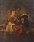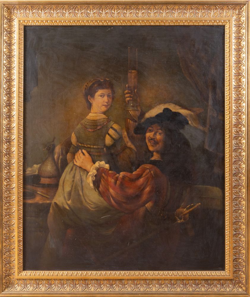 Pittore del XX secolo. "Scena d'interno". Olio su tela. Cm 130x107,3. Copia da Rembrandt.