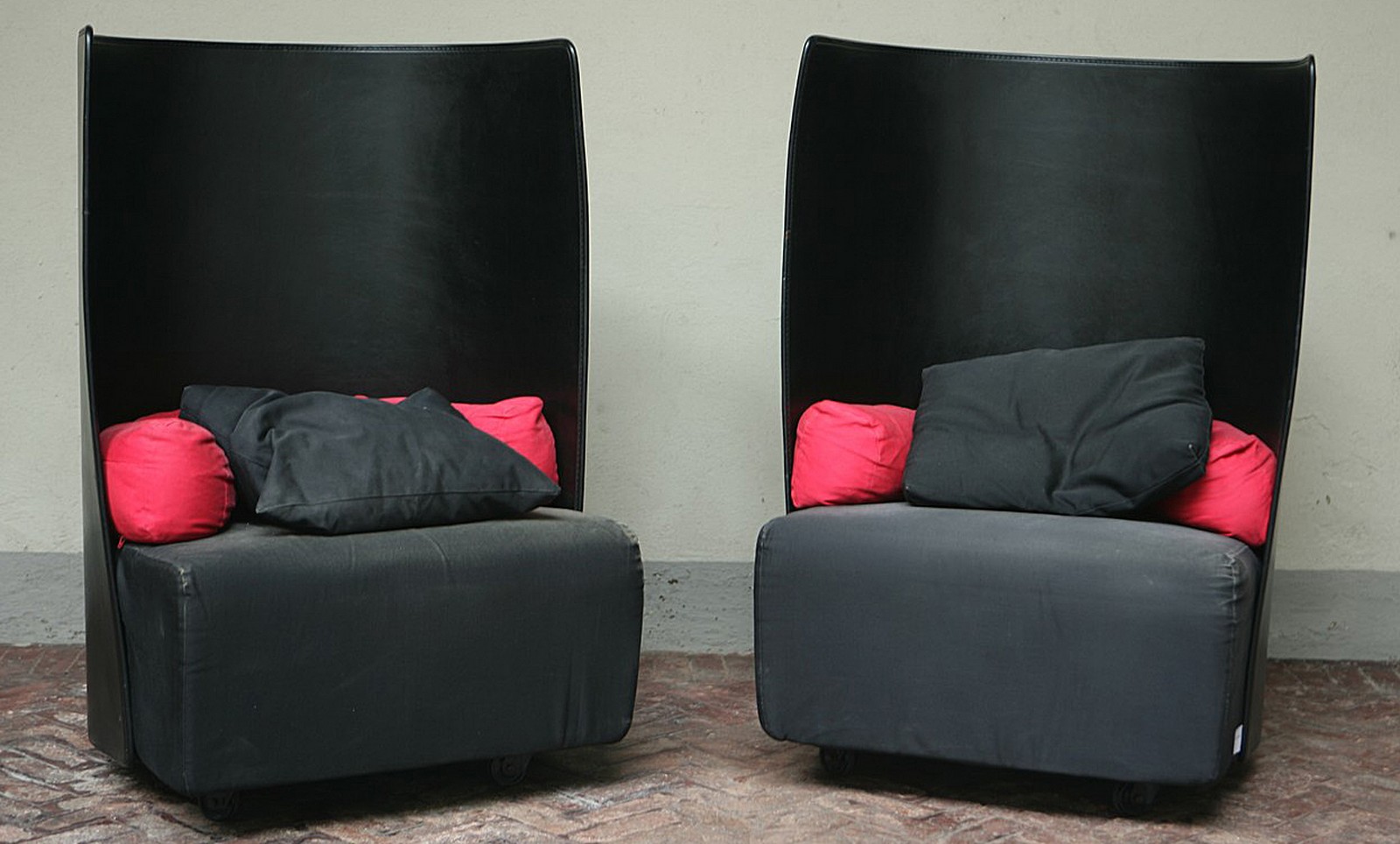DE PAS - D'URBINO - LOMAZZI. Due poltrone modello Campo per Zanotta. Two armchairs for Zanotta. Legno e cuoio. Cm 72x110x65. Struttura in legno , ricoperto di cuoio e seduta in tessuto originale, con i suoi cuscini. Woodden structure covered with black leather,seat in original fabric, with it's own cushions . 1984.