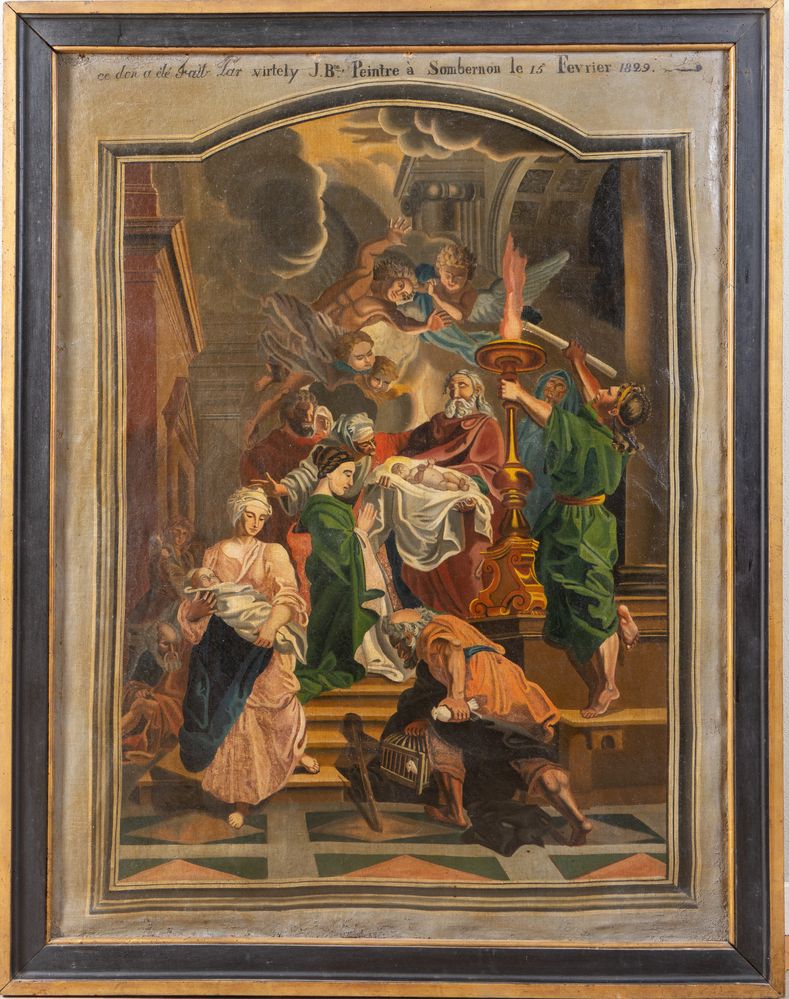 Maestro francese del XIX secolo. "Scena sacra", 1829. Olio su tela. Cm 115,5x88. In alto reca scritta.
