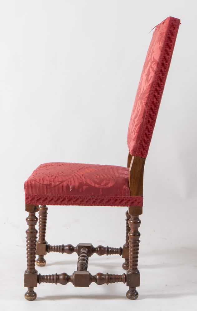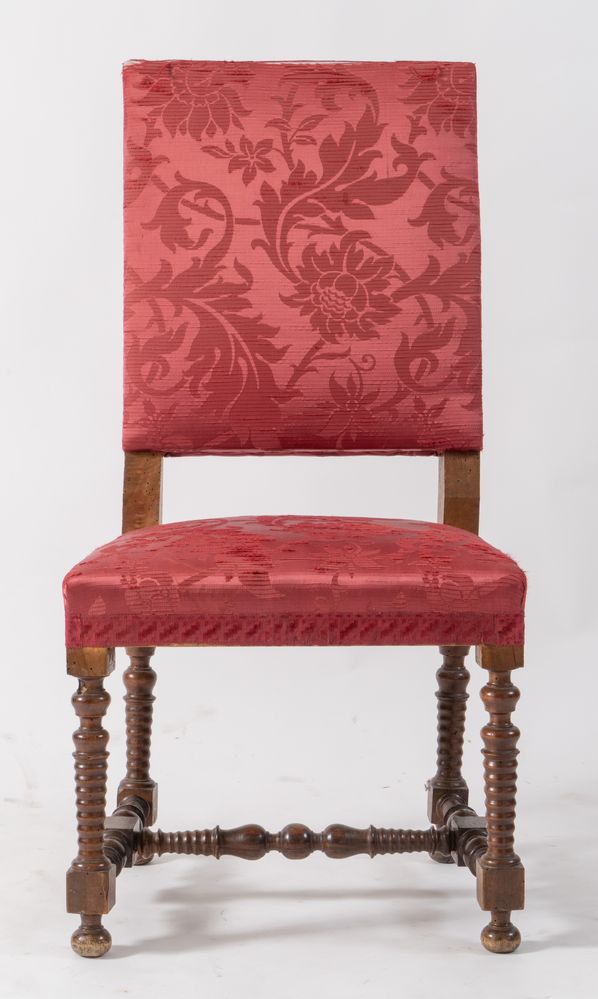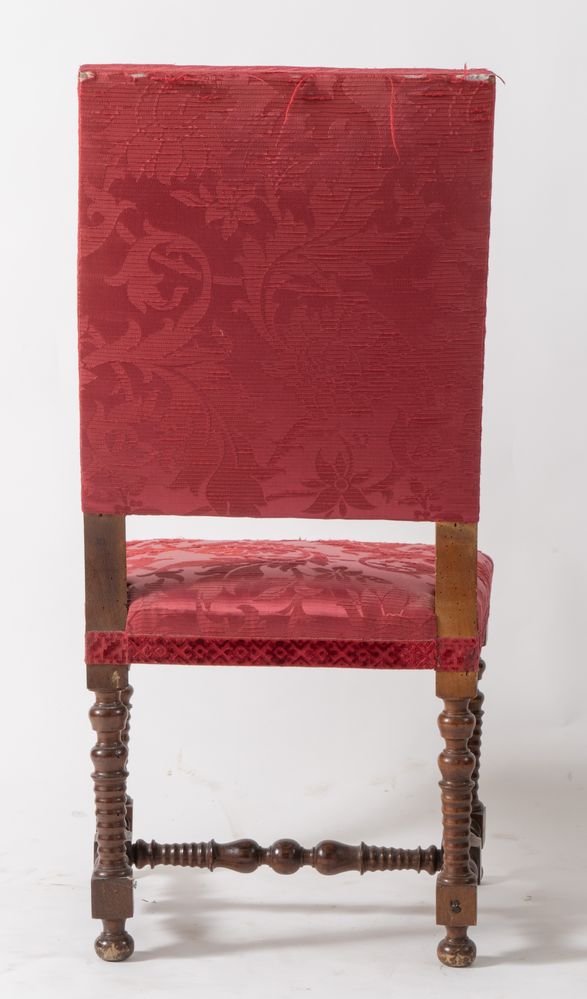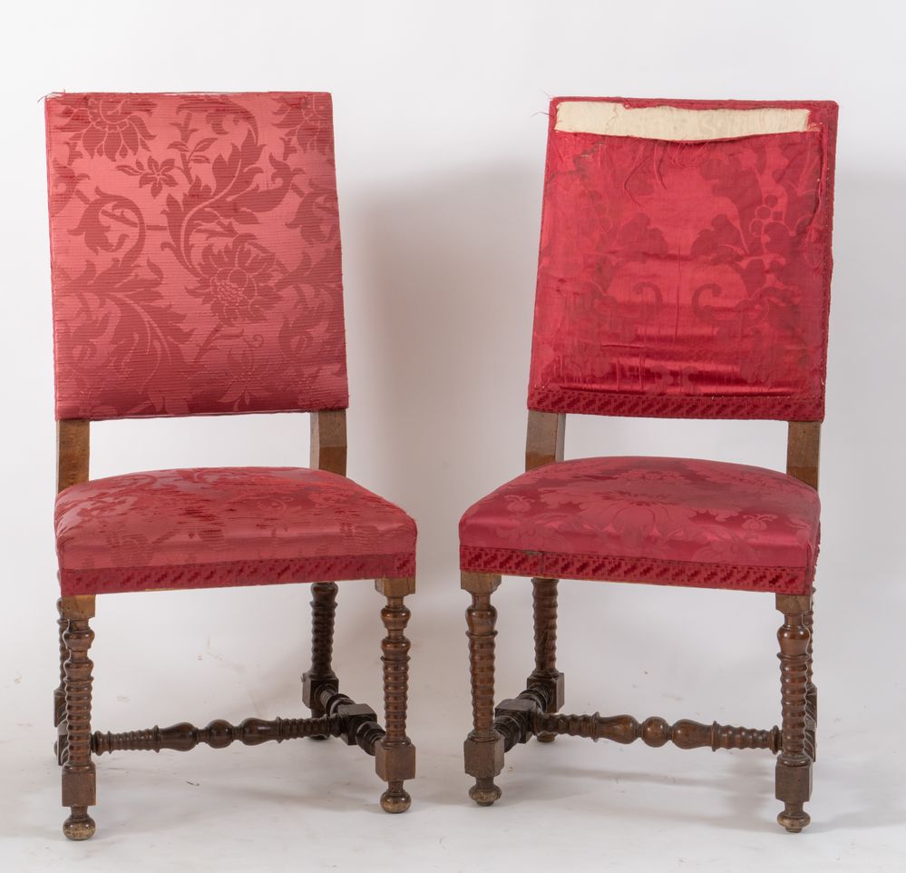 Coppia di sedie a rocchetto in massello di noce. Romagna, seconda metà del XVII secolo. Cadauna di cm 106,5x53,5x50.