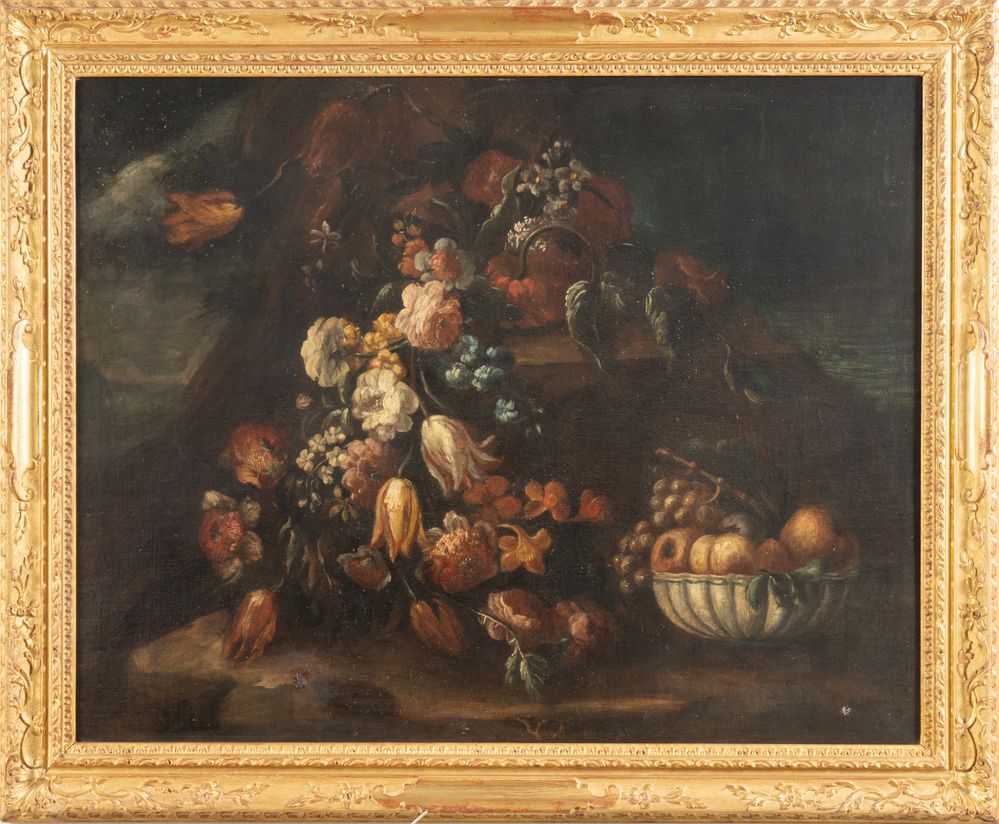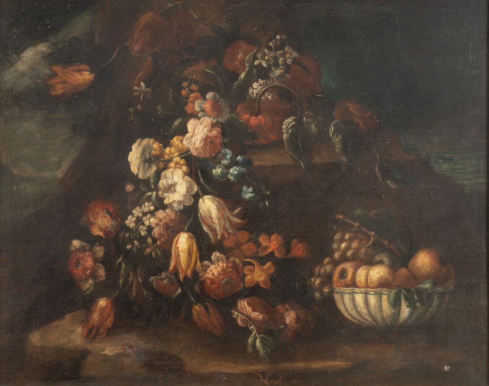 Maestro del XVIII secolo. "Natura morta con fiori e frutta". Olio su tela. Cm 65x81,5.