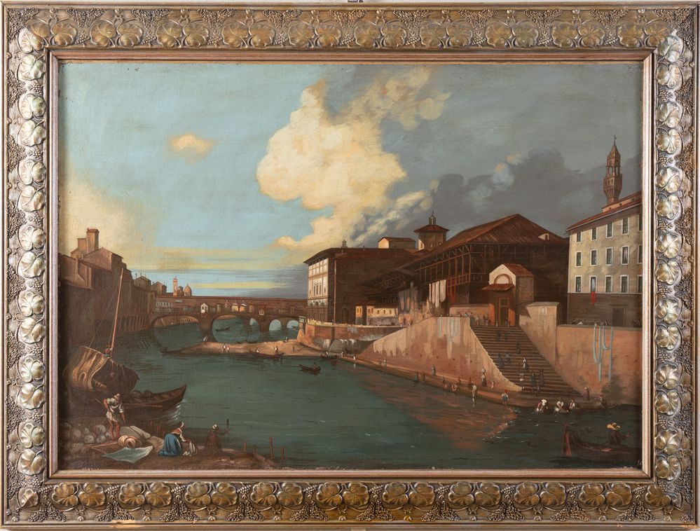 Maestro della fine del XVIII secolo. "Veduta di Firenze". Olio su tela. Cm 69,5x99,5.