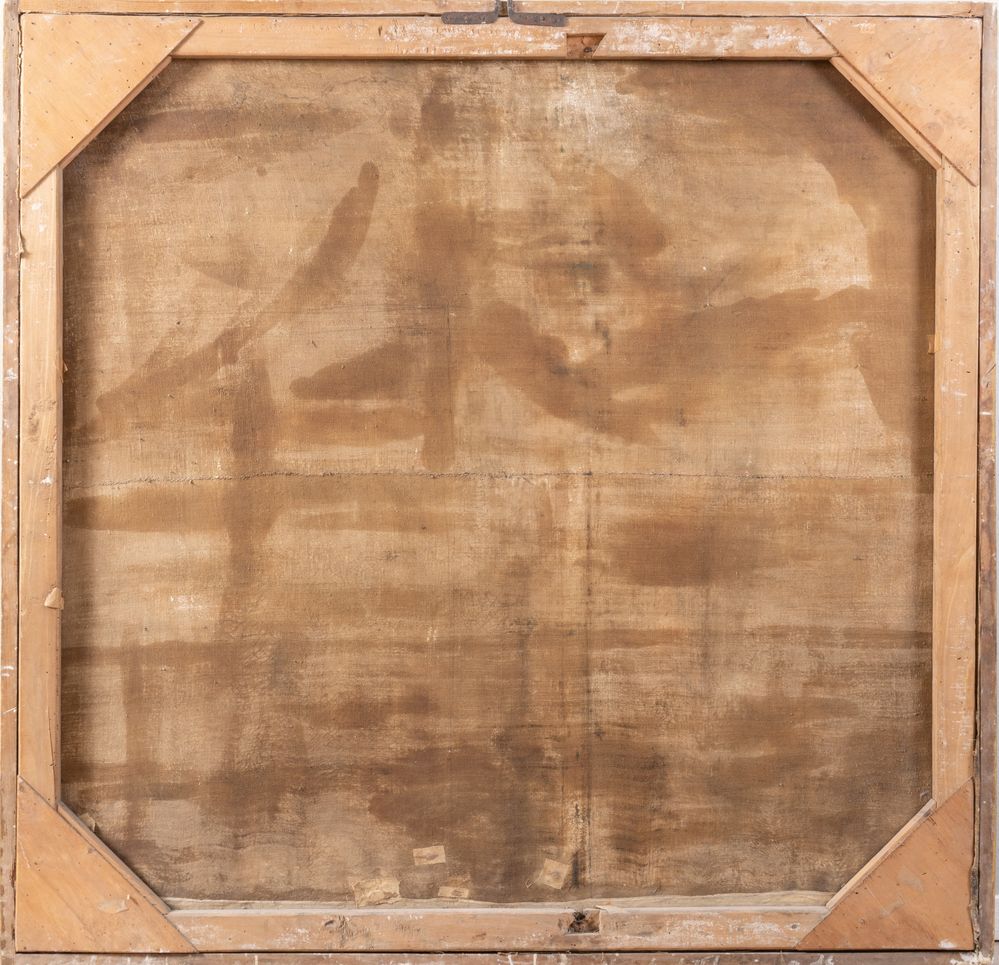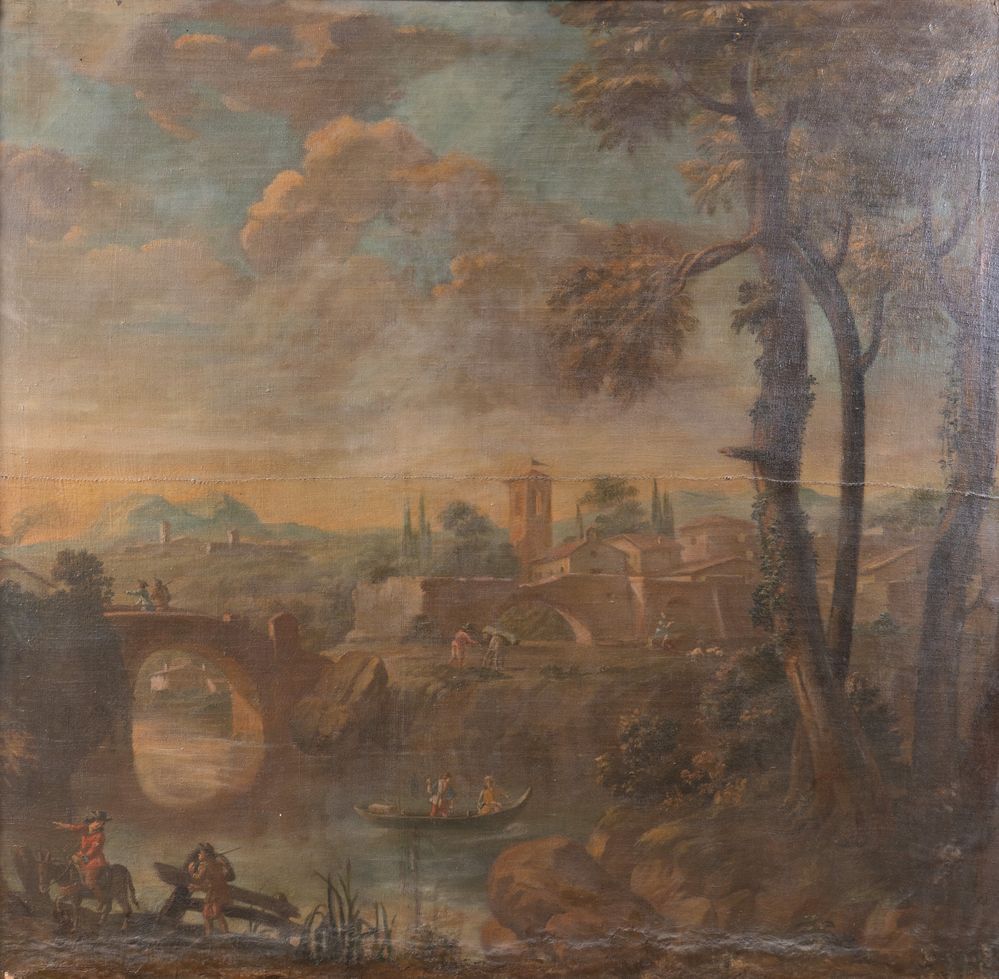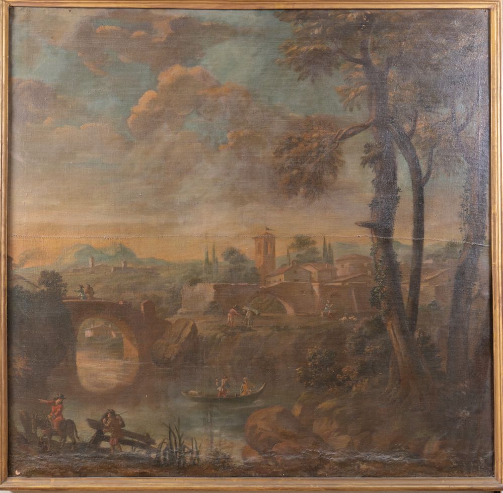 Maestro del XVIII secolo. "Paesaggio fluviale con figure". Olio su tela. Cm 140x144. Prima tela.