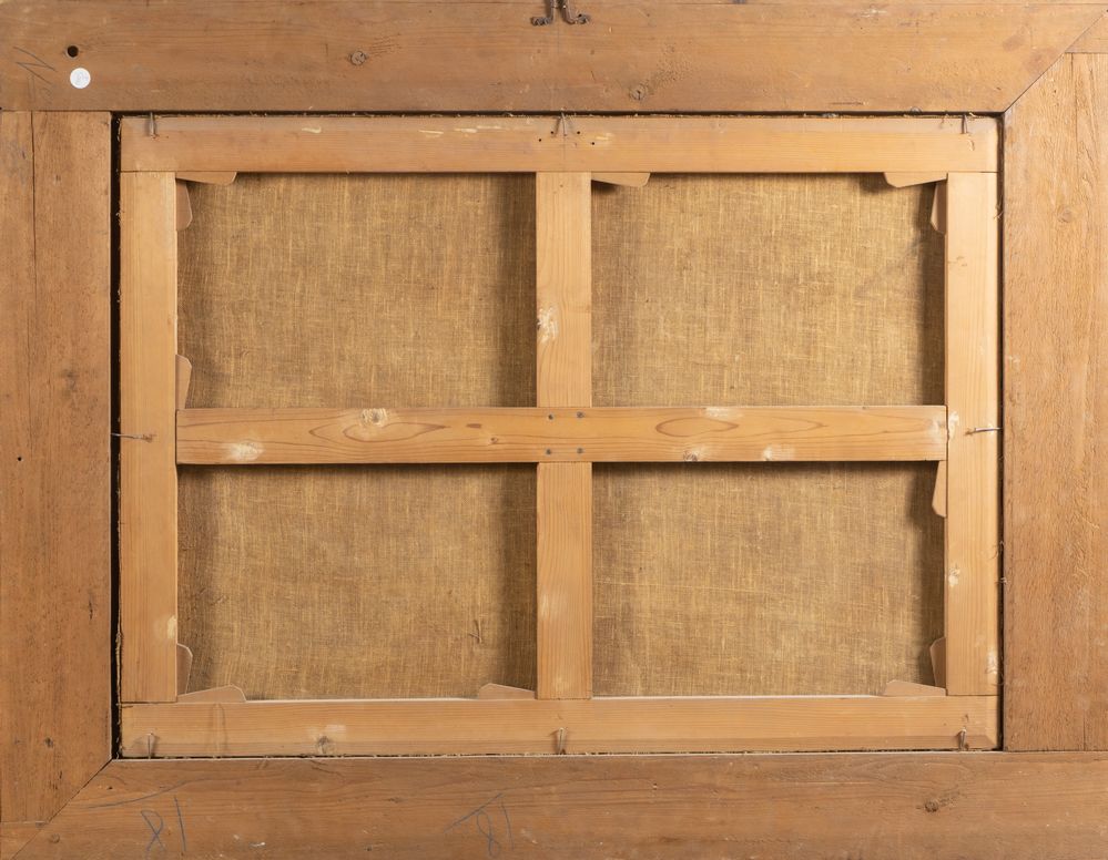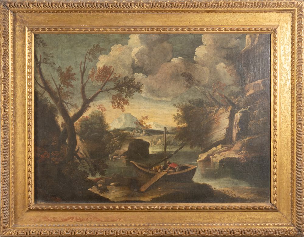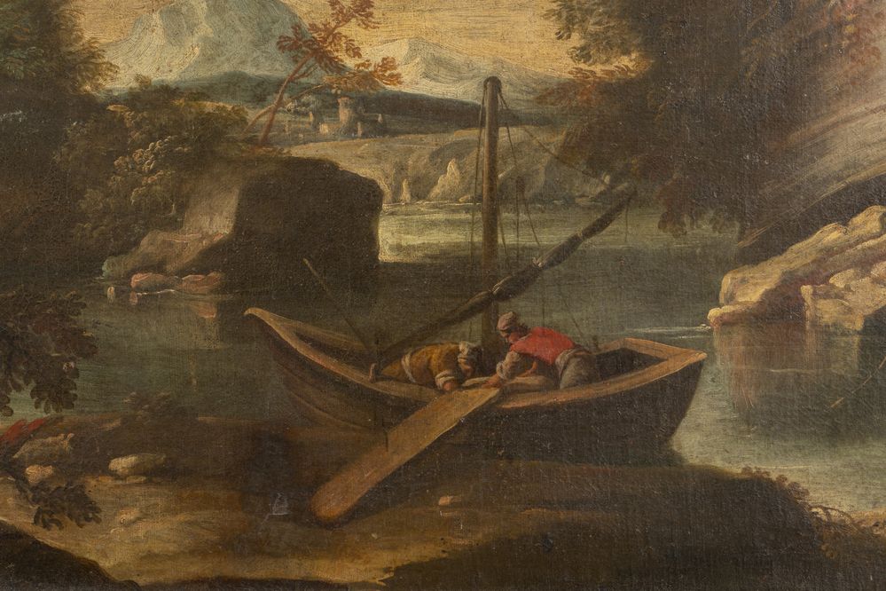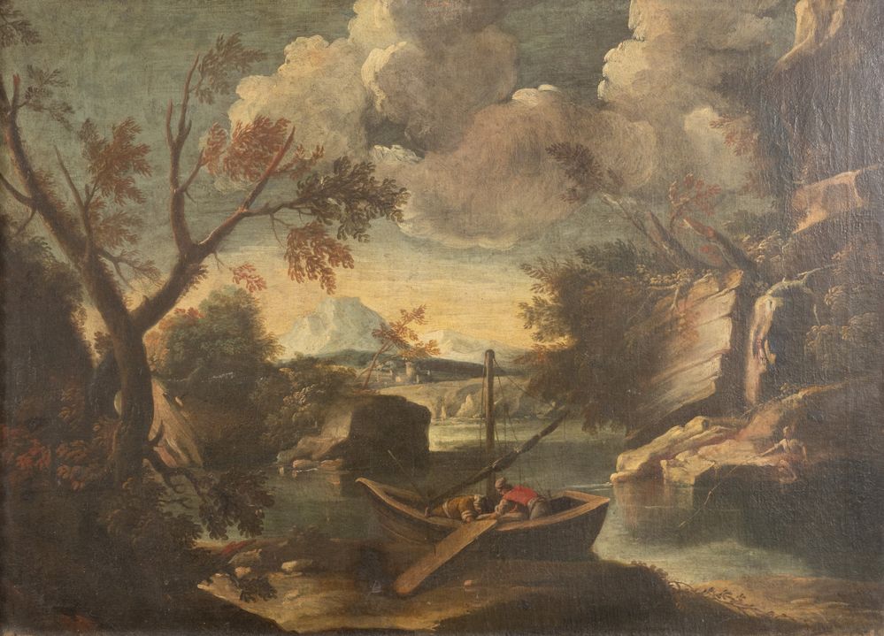 Ambito di Salvator Rosa, XVII secolo. "Paesaggio fluviale con figure". Olio su tela. Cm 86,5x121.