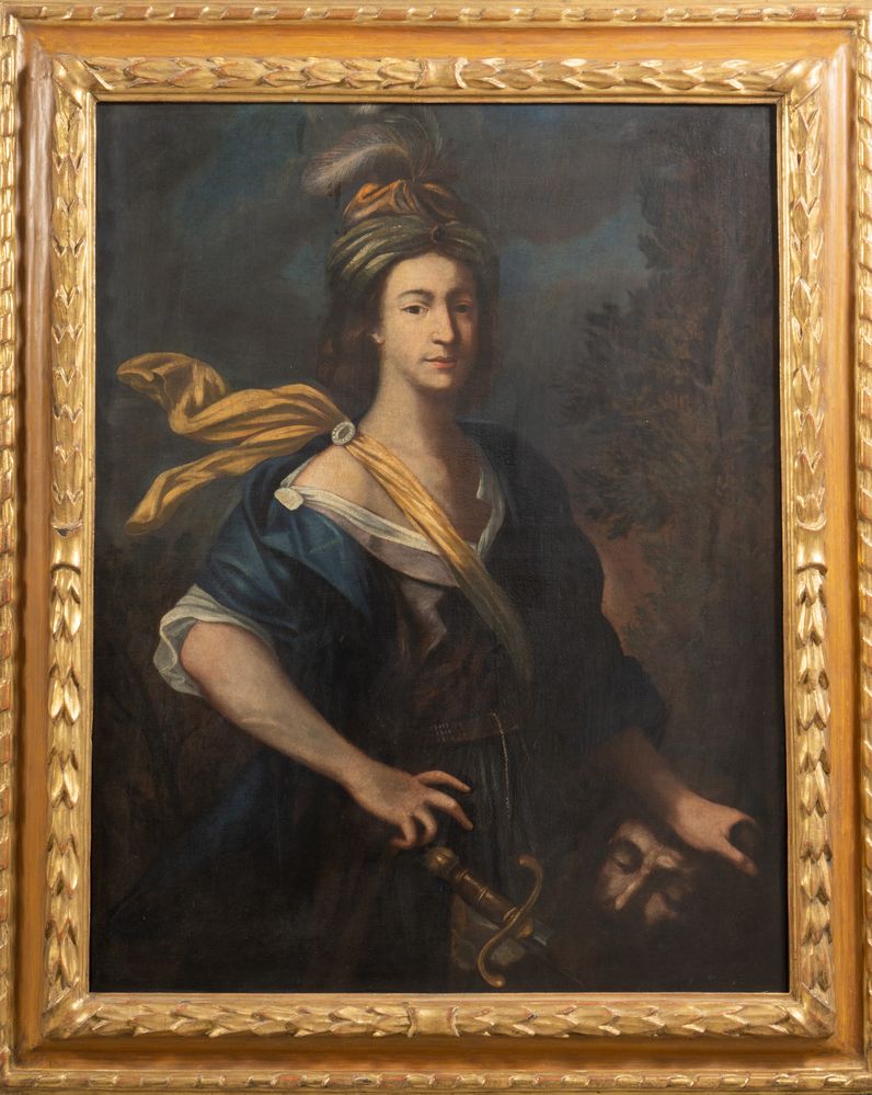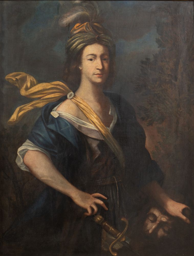 Maestro del XVII secolo. "Davide e Golia". Olio su tela. Cm 121x91.