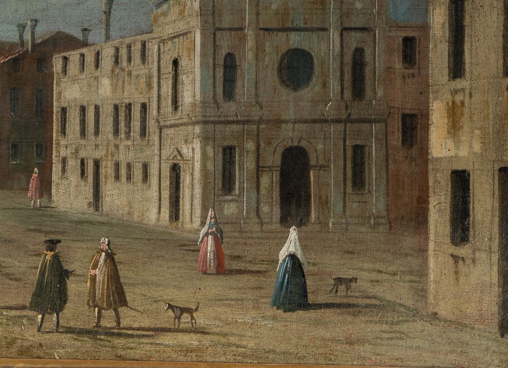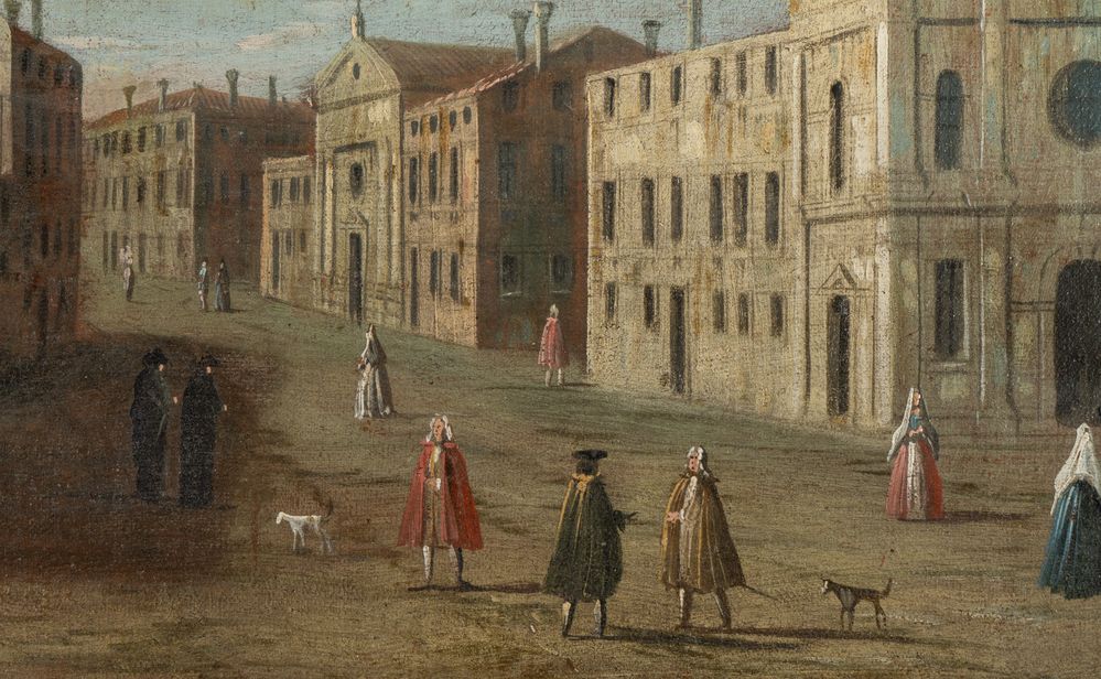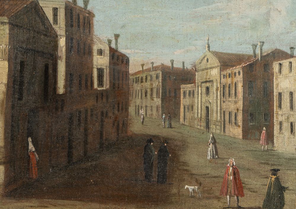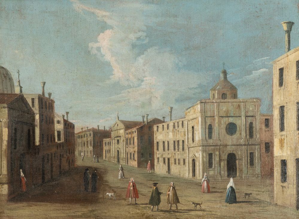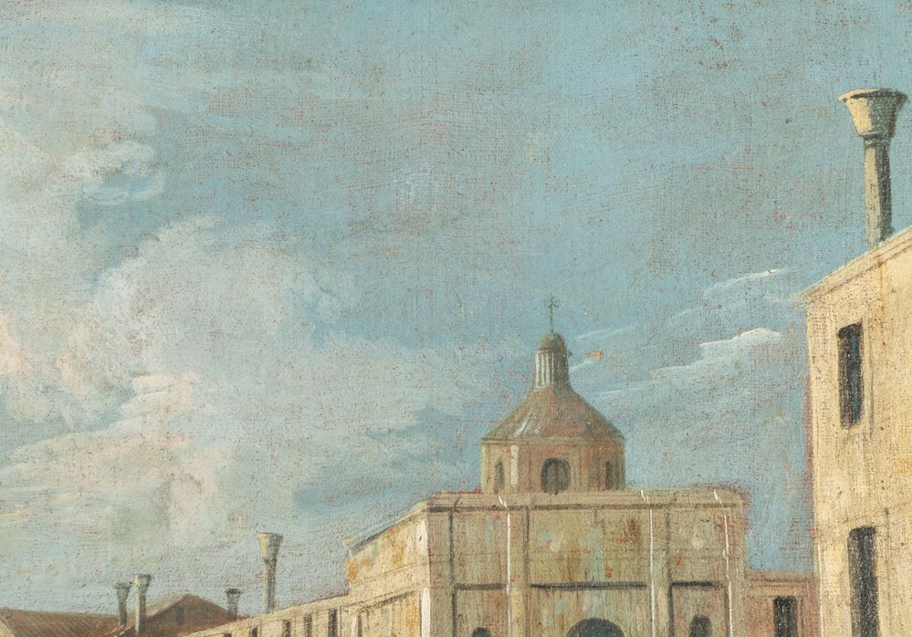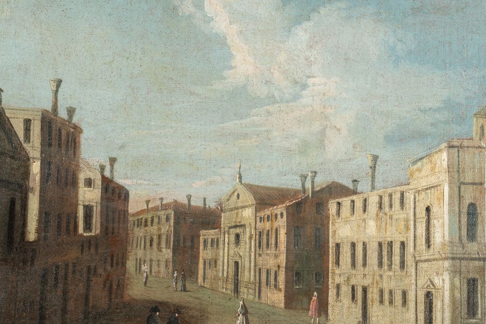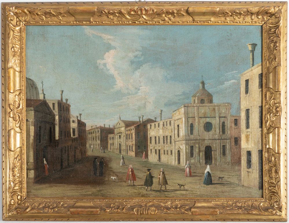 Maestro della Fondazione Langmatt (Apollonio Facchinetti detto Domenichini) (1715 - 1770) "Veduta ideale di città veneta". Olio su tela. Cm 56,5 x 73,5. Opera accompagnata da perizia della Dottoressa Bozena Anna Kowalczyk.
