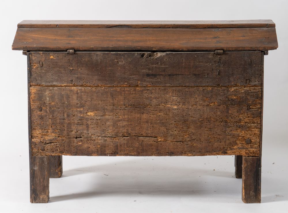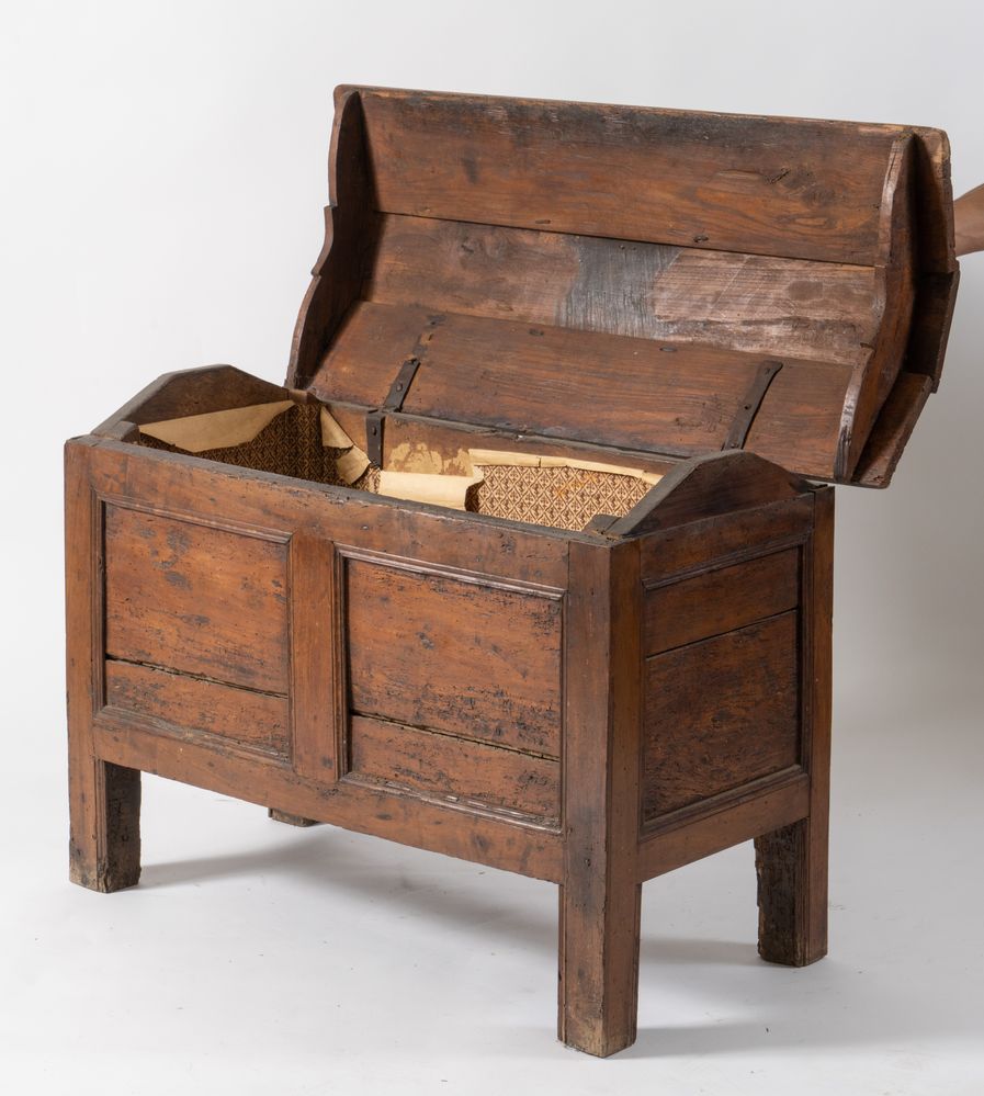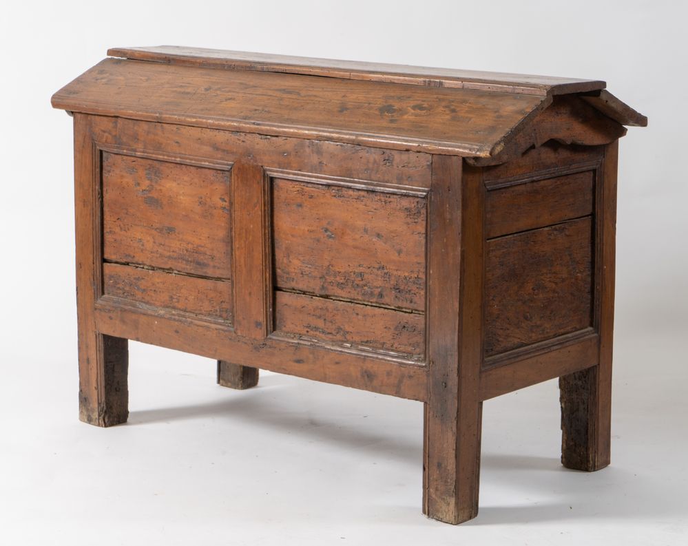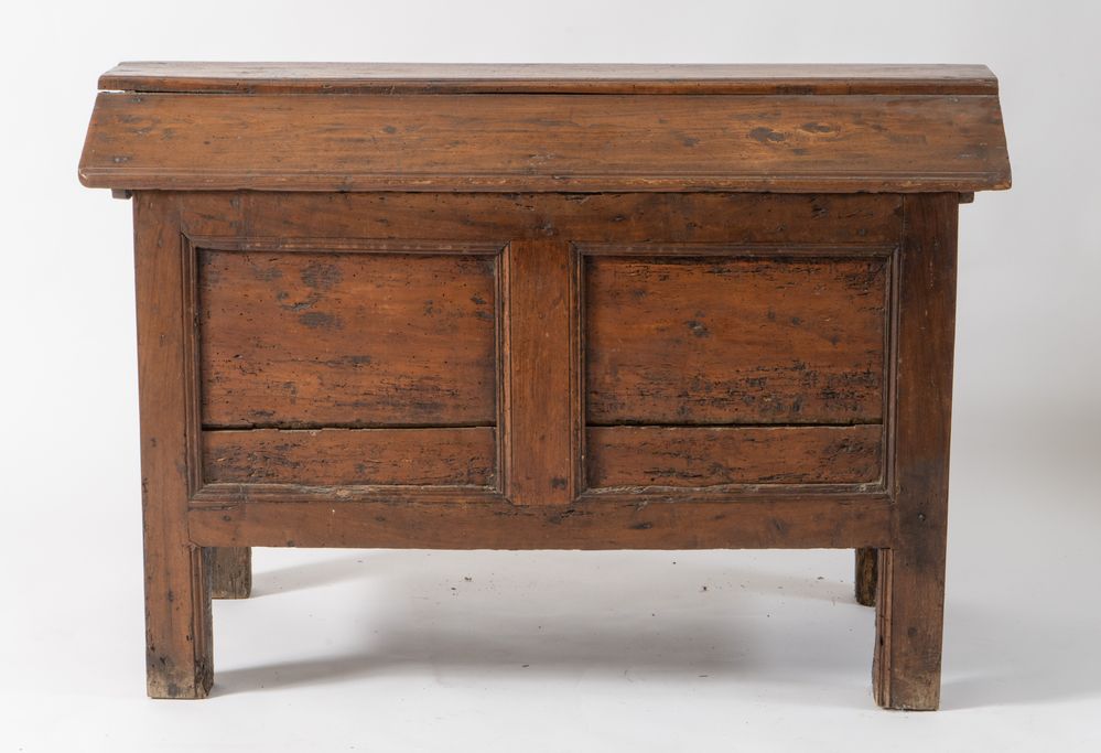 Piccolo arcile in massello di olmo. Emilia, seconda metà del XVII secolo. Reca fronte e fianchi riquadrati in cornice modanata. Cm 72x106x47.