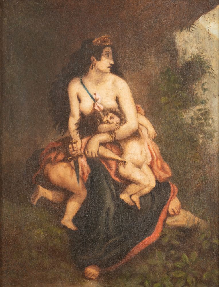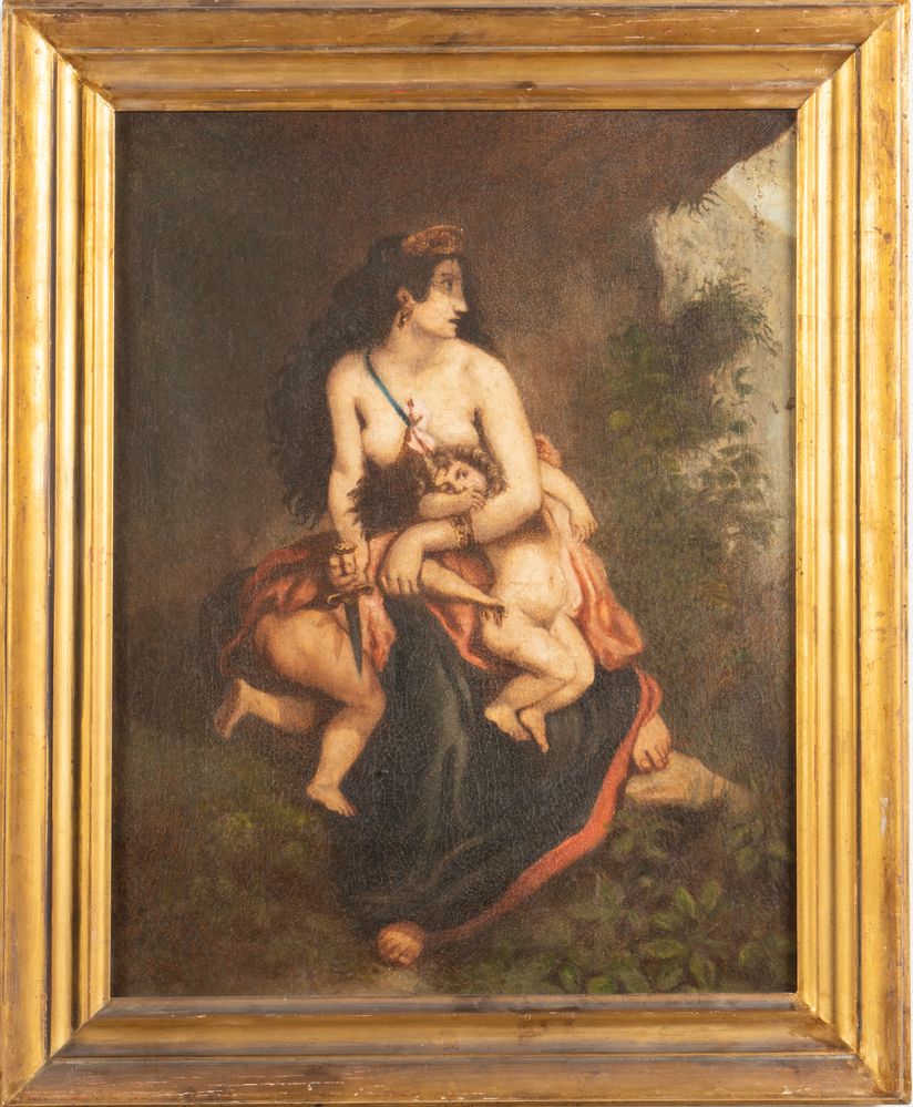 Maestro del inizi del XX secolo. "La furia di Medea". Olio su tela. Cm 64,5x50. Copia da Delacroix.