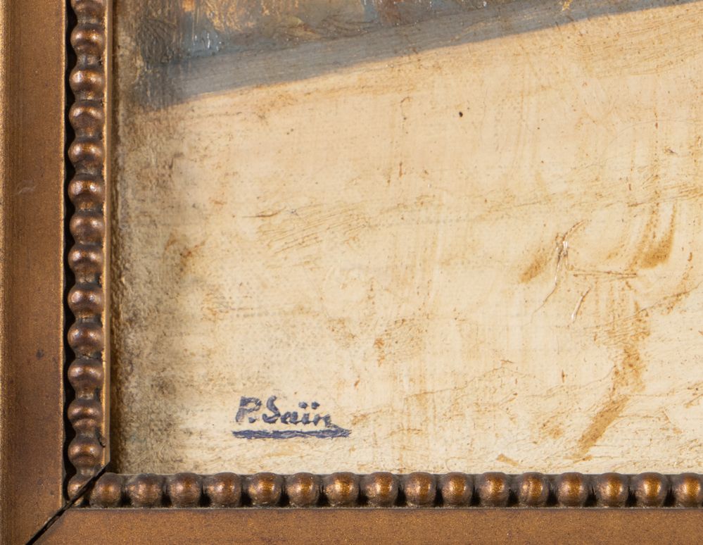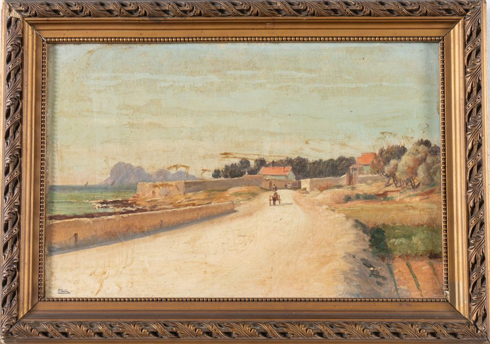 PAUL SAIN (Avignone 1853 - 1908) "La route vers la Ciotat a St. Cyr chez Lumiere". Olio su tela. Cm 27,5x42. Opera firmata in basso a sinistra P. Sain. Al retro opera intitolata La route vers la Ciotat a St. Cyr chez Lumiere.