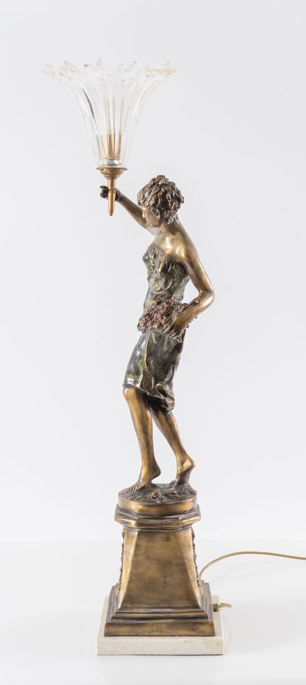 Lampada da tavolo in bronzo con base in marmo e paralume in vetro soffiato....