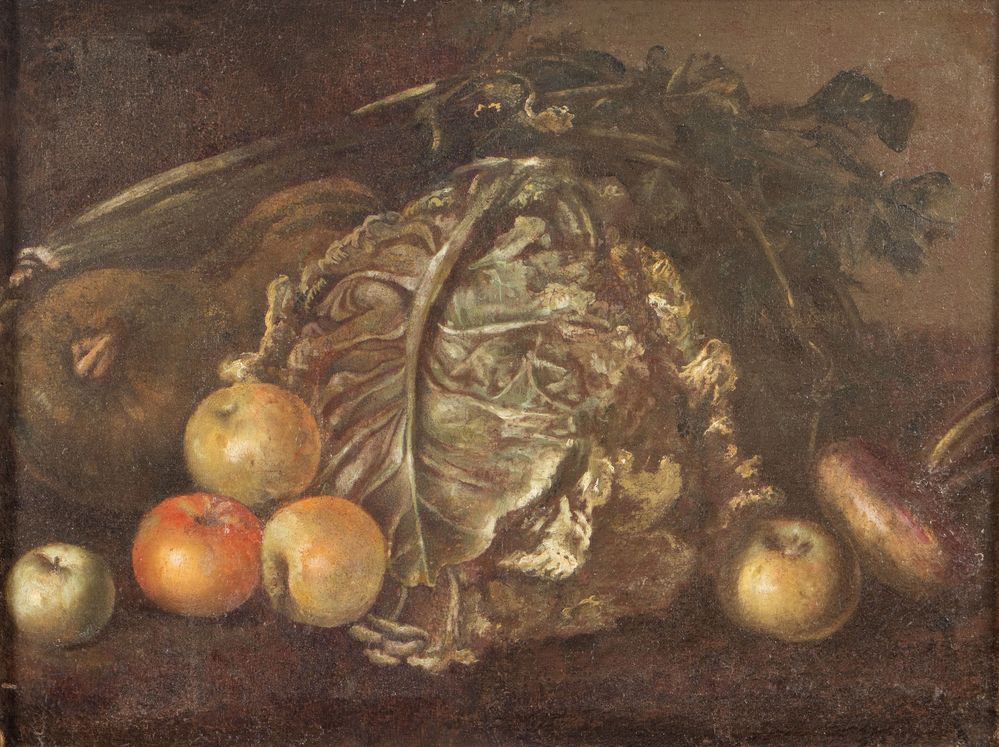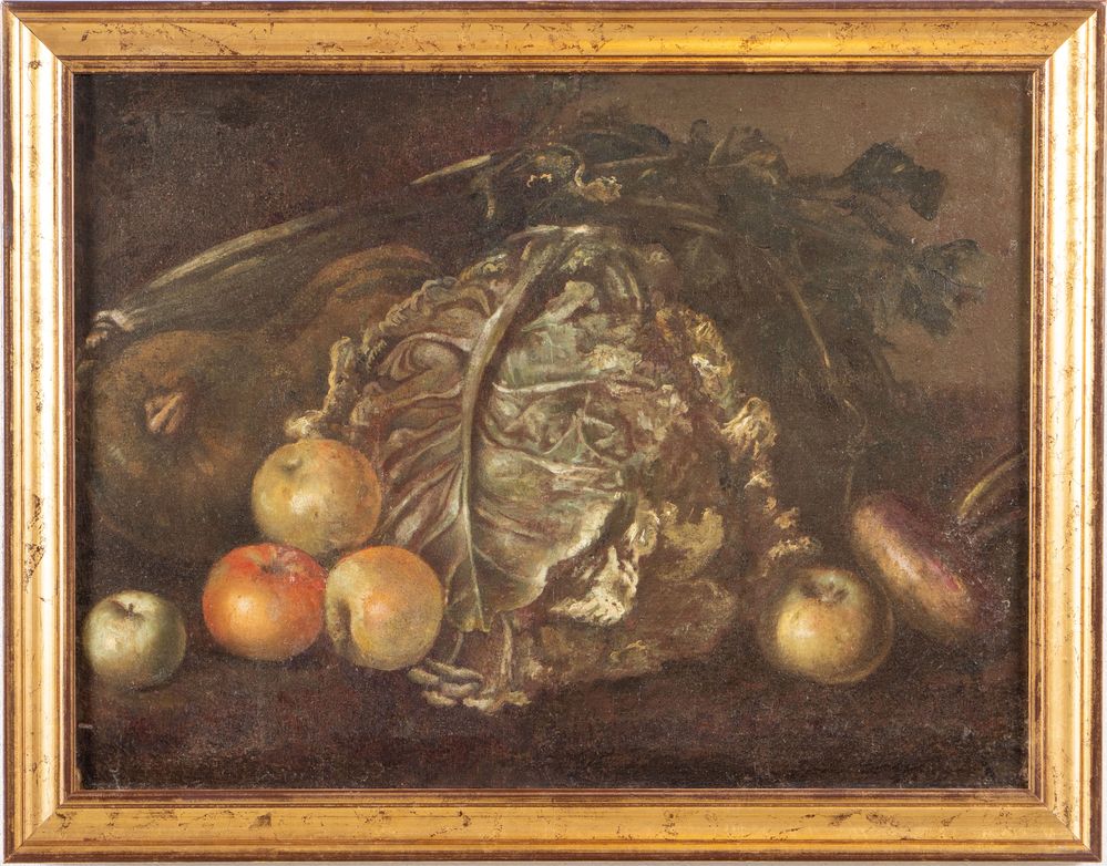 Lotto 391 | Maestro del XVII secolo "Natura morta con ortaggi e frutta". Olio su tela. Cm...