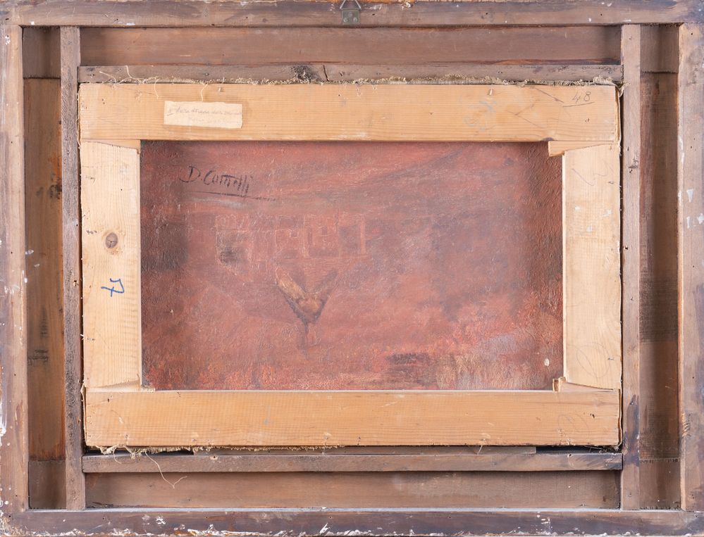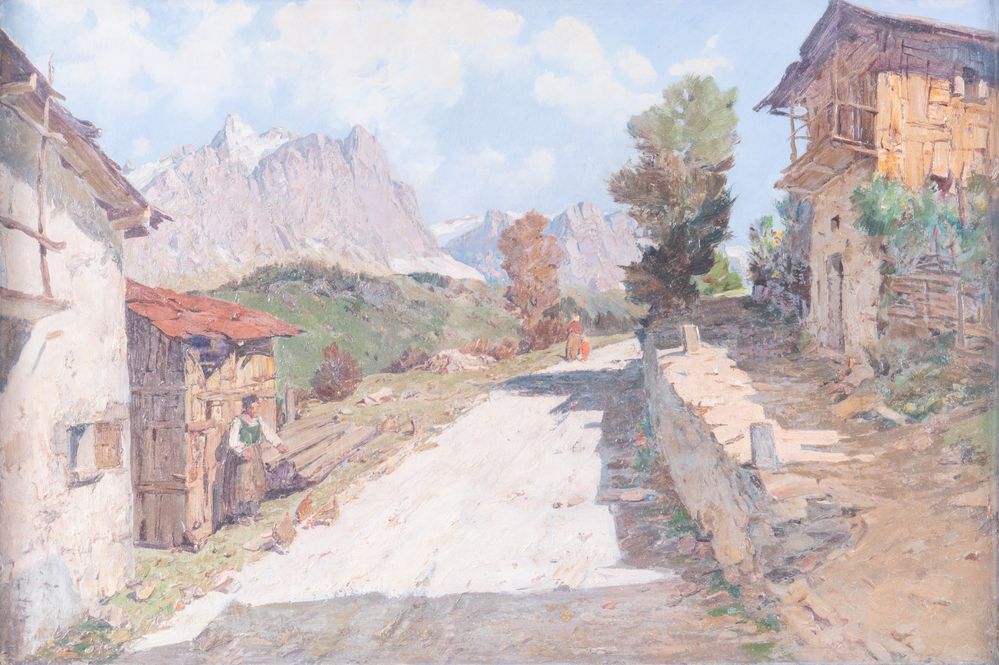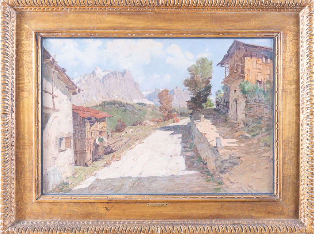 DANTE COMELLI (Bologna 1880 - 1958) "Sulla strada delle Dolomiti. Moena, Val di Fiemme". Olio su tela. Cm 49,5x73. Opera firmata al retro D. Comelli. Al retro reca etichetta Sulla strada delle Dolomiti. Moena, Val di Fiemme.