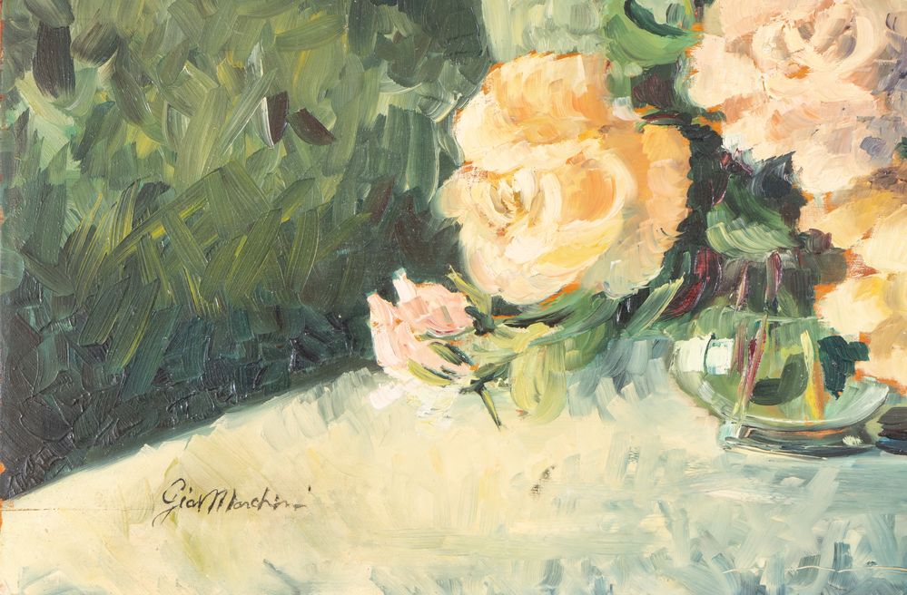 GIOVANNI MARCHINI (Forlì 1877 - 1946) "Rose". Olio su tavola. Cm 50x70. Opera firmata in basso a sinistra Gio Marchini. Al retro opera firmata Giovanni Marchini.