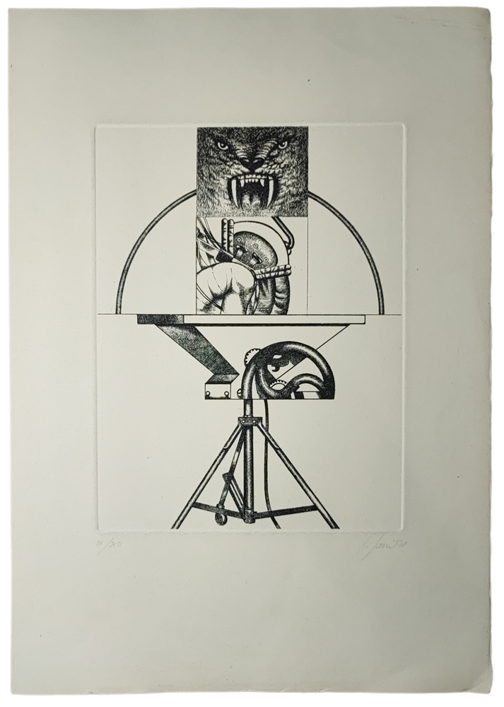 Firma non decifrata, Composizione con tigre, 1997, puntasecca 35x50 cm, firma e anno in basso a destra, tiratura III/XII in basso a sinistra.