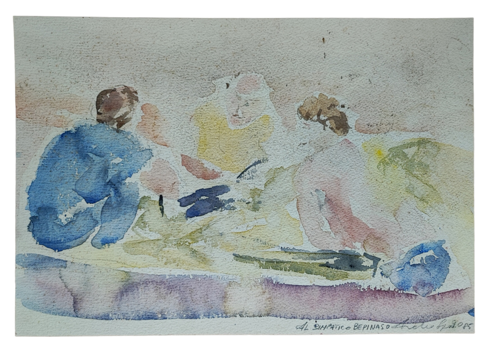 Firmato A. Buso PERSONAGGI, 1985 Acquarello su carta 37x27 cm; firma, anno e dedica ad personam in basso a destra.